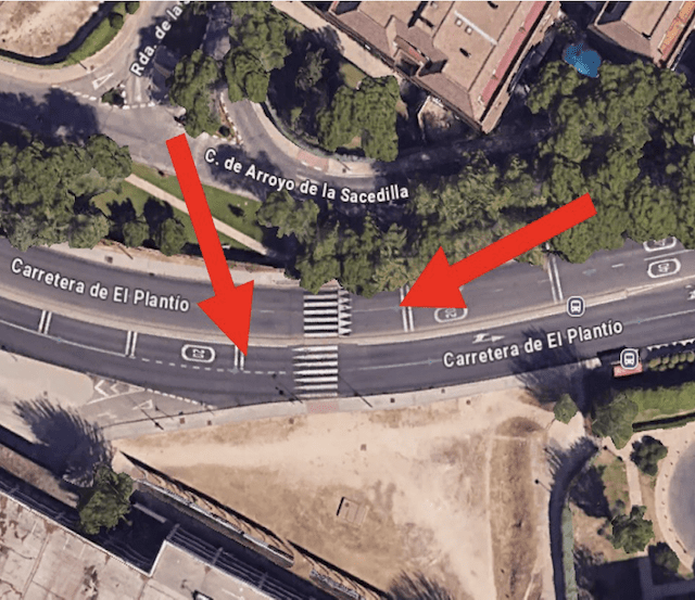 Paso de peatones cercano a la parada de autobús “Ctra.Plantío-Urb.La Sacedilla” con los «resaltos» ilegales.