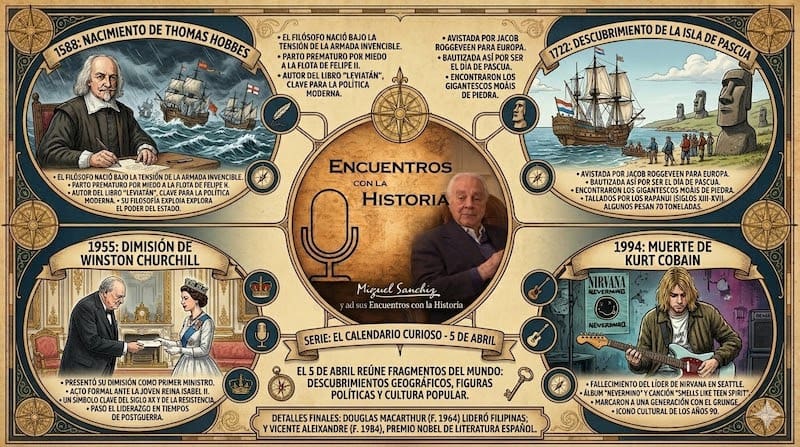 MIGUEL SANCHIZ. (Majadahonda, 5 de abril de 2026). “El calendario curioso”: 5 de abril: una isla misteriosa, filósofos, líderes y la voz de una generación. El calendario es una especie de archivo silencioso donde cada día guarda fragmentos de la historia del mundo. A veces se trata de descubrimientos geográficos inesperados, otras de personajes que marcaron la política internacional o de artistas que cambiaron la cultura popular. El 5 de abril es una de esas fechas en las que confluyen exploraciones lejanas, pensamiento filosófico, grandes líderes del siglo XX y momentos que dejaron huella en la música contemporánea. Uno de los acontecimientos más sorprendentes asociados a este día ocurrió en 1722, cuando el navegante neerlandés Jacob Roggeveen avistó por primera vez para Europa una pequeña isla perdida en medio del océano Pacífico. Era el Domingo de Pascua, motivo por el que la expedición decidió bautizarla como Isla de Pascua. leer más…