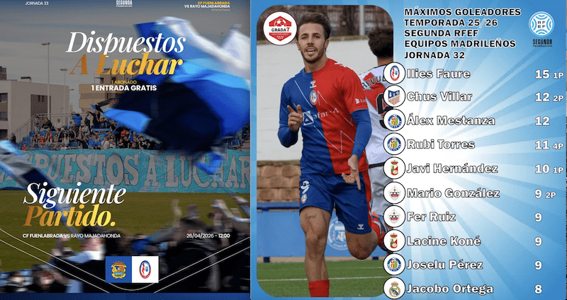 MIGUEL FERNÁNDEZ. (Majadahonda, 25 de abril de 2026). El Rayo Majadahonda sigue vivo en la lucha por el título, pero debe ganar en Fuenlabrada. La jornada 33 de la Segunda Federación llega con horario unificado este domingo 26 de abril a las 12:00 de la mañana, un contexto que añade aún más tensión a una pelea por arriba y por abajo completamente abierta. En ese escenario, el duelo entre el CF Fuenlabrada y el Rayo Majadahonda se presenta, fuera de tópicos, como una auténtica final para ambos equipos. Por un lado, tenemos la pelea por el ascenso directo, con una UD San Sebastián de los Reyes, actual 1º que recibe al Real Madrid C en un partido donde los blancos también están obligados a puntuar. Su situación es límite, a solo 1 punto del descenso, pero empatados con la zona de playout, y con una última jornada ante el UB Conquense, que previsiblemente será 4º y se jugará la promoción. Por tanto, el margen de error de los madridistas es mínimo, al jugar contra 1º y 4º. Eso sí, el Real Madrid C llega en una dinámica espectacular tras ganar 5 de los últimos 7 encuentros, habiendo perdido únicamente contra el Coria. El Rayo Majadahonda estará pendiente del Coria y Tenerife, ya que al depender de que el Sanse falle, los majariegos necesitan que el Tenerife B llegue con opciones a la última jornada, en la cual se enfrentan en las islas al Sanse, que posee solo 1 punto de ventaja sobre el Rayito, leer más…