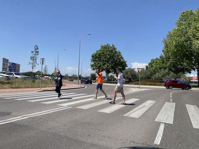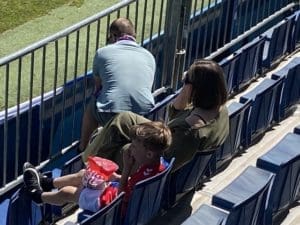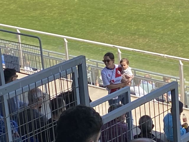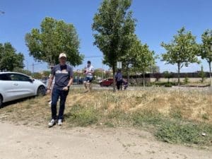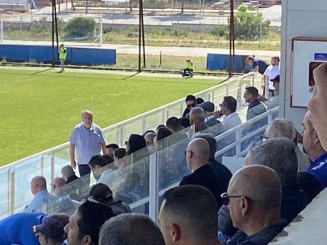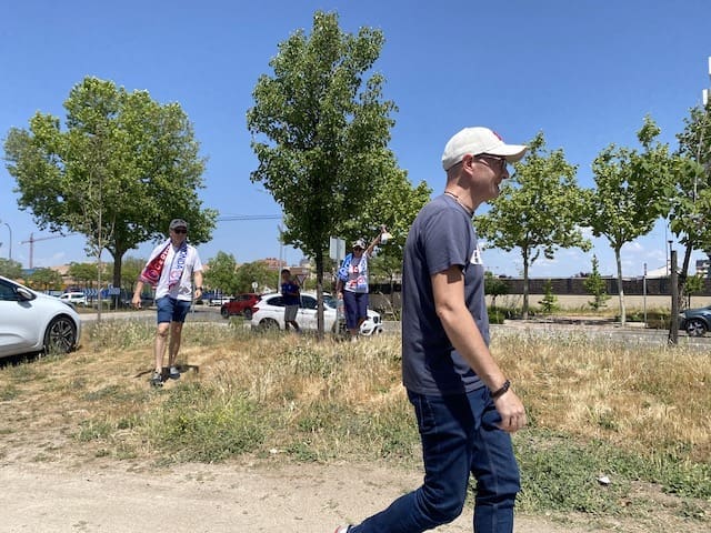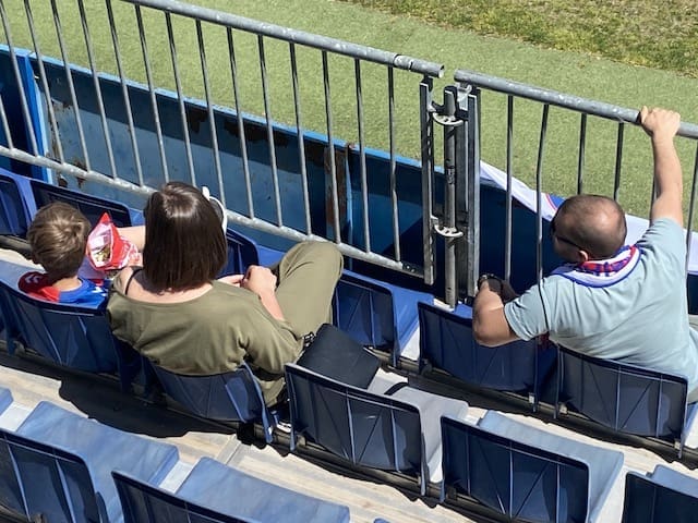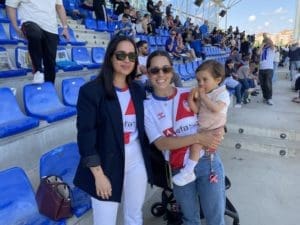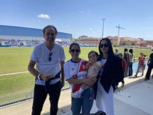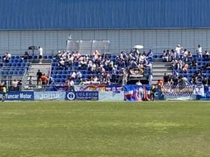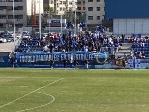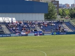 Federico Martínez, futbolero, concejal y portavoz adjunto de «Vecinos por Majadahonda» con aficionadas majariegas en Fuenlabrada. También estuvo el portavoz Carlos Bonet en la grada de animación