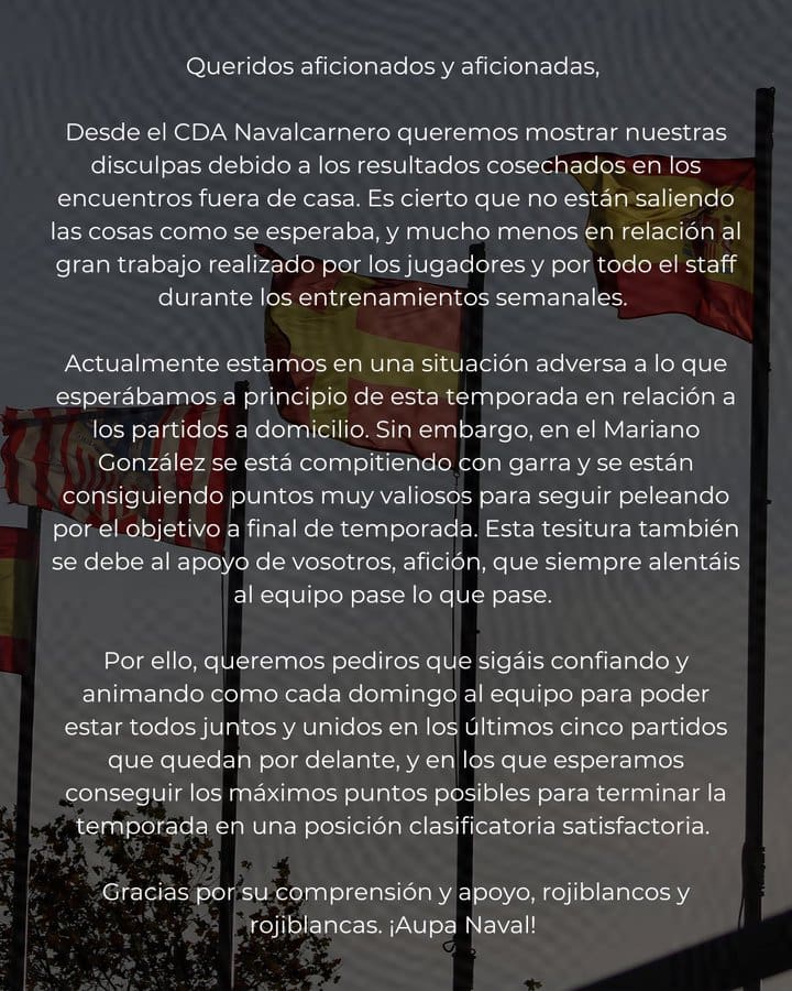 El Navalcarnero ha hecho del Mariano González un auténtico fortín, justo al contrario que su rendimiento como visitante, donde es el peor visitante de todo el grupo, todavía no ha ganado fuera, lo que le ha llevado a coquetear con los puestos de descenso. De hecho, el “Naval” ha emitido un comunicado esta semana pidiendo disculpas a los aficionados por su mala dinámica como visitante.