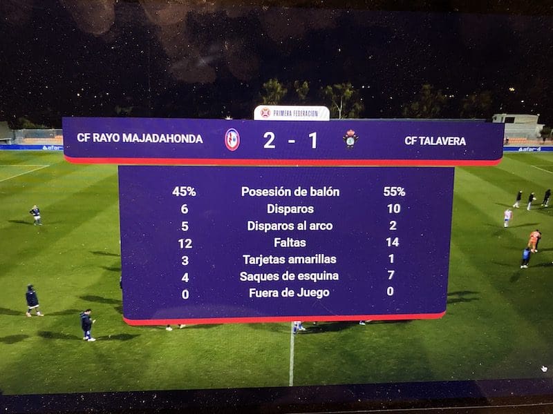 «Aunque apenas quedaba tiempo, lo ha intentado el cuadro talaverano, que en el 87′ ha pedido un penalti por presunta mano en el área de un jugador local y en la prolongación ha visto cómo Buenacasa era objeto de falta por parte del propio Ofoli cuando se iba solo hacia el área rival, despidiéndose así de la ocasión de empatar. ‘GOAL AVERAGE’ MAJARIEGO. El pitido final del colegiado asturiano Ruiz Álvarez ha certificado la cuarta victoria liguera consecutiva en casa del Rayo Majadahonda, que con este 2-1 suma los 3 puntos en juego ante los cerámicos y les gana el ‘goal average’ particular, ya que los madrileños vencieron 0-2 en el partido de la primera vuelta en El Prado. El CF Talavera, por su parte, sufre su tercera derrota en las tres últimas jornadas, la racha más negativa del equipo cerámico desde que Pedro Díaz en su entrenador, y se coloca penúltimo empatado a puntos con el colista Pontevedra CF, a seis de los puestos de salvación que abre el CD Badajoz.»