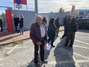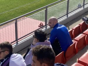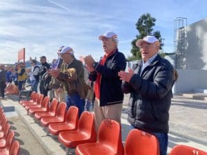 José Estévez, leyenda majariega como ex futbolista rayista, aplaudiendo al equipo junto a sus amigos de «peña»
