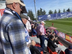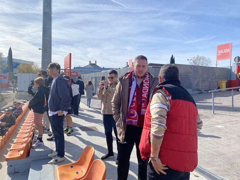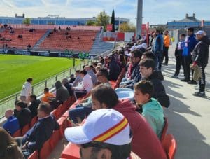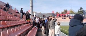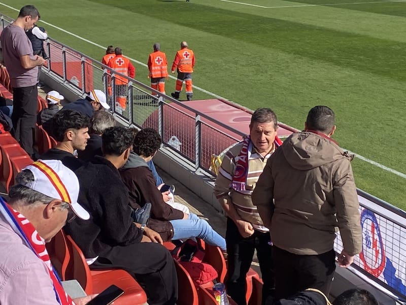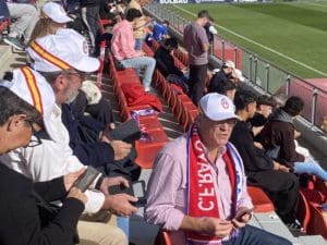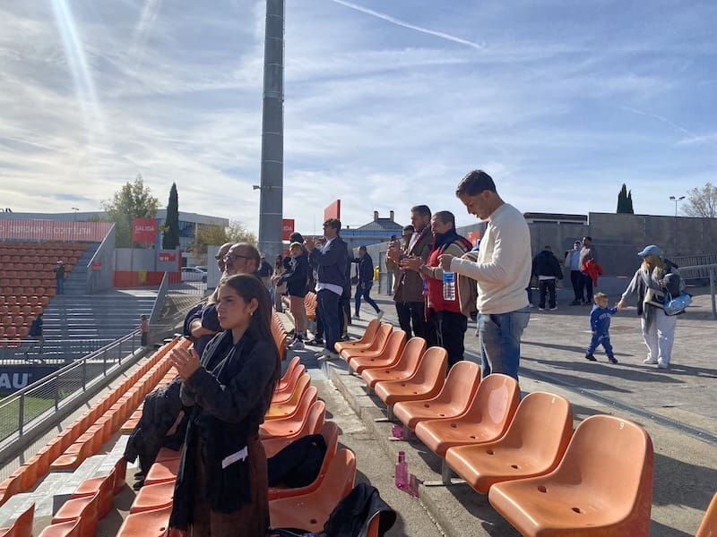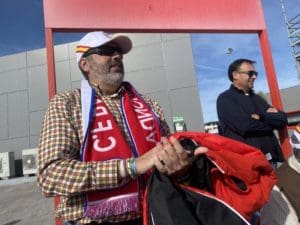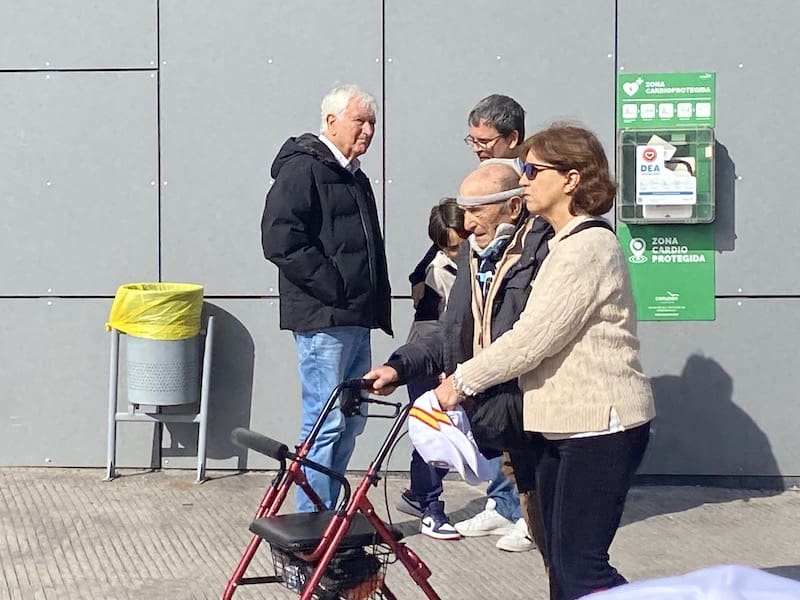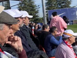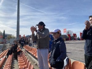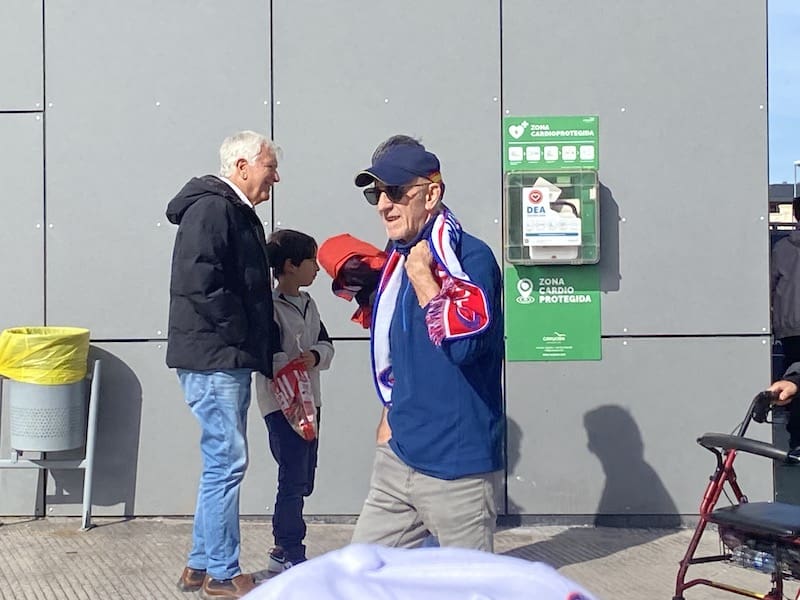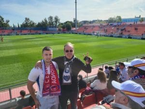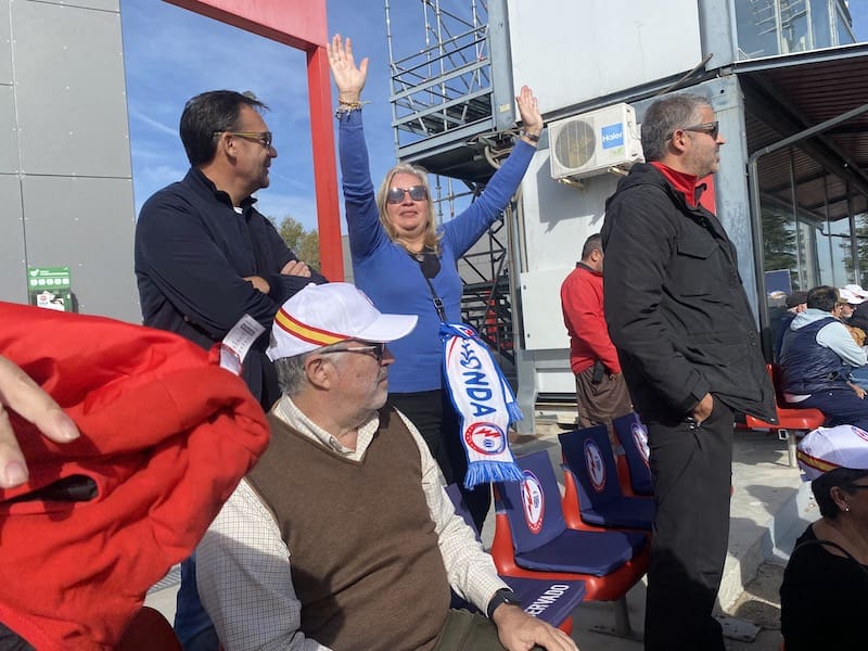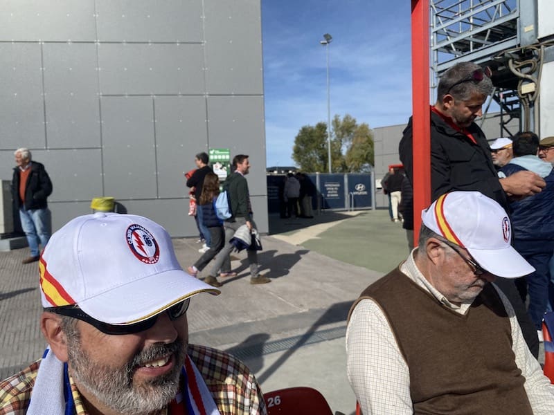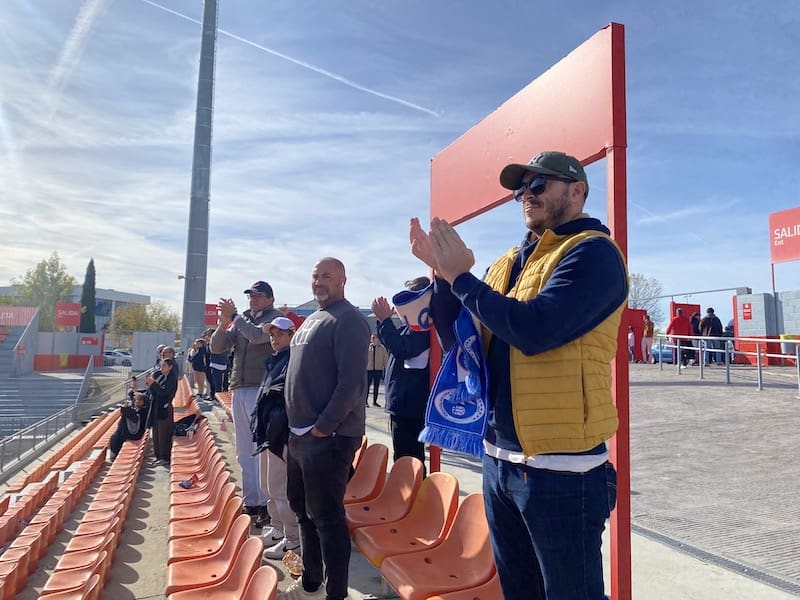 José Estévez, leyenda majariega como ex futbolista rayista, aplaudiendo al equipo junto a sus amigos de «peña»