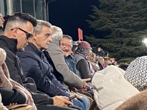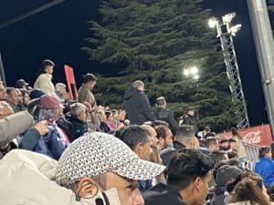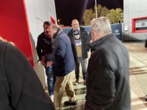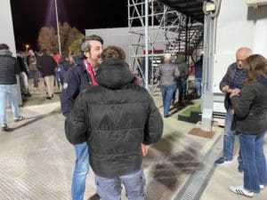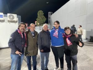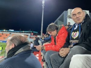 Manolo Hernández junto a un nutrido grupo de conocidos aficionados comentando el partido en el descanso