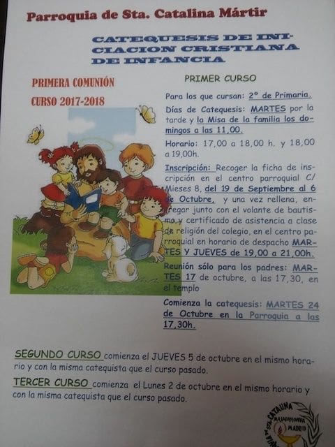 PRIMER CURSO: Comienza la catequesis el martes 24 de octubre en la parroquia a las 17:30 horas, el resto de las clases se impartirán en las aulas del despacho parroquial los martes por la tarde de 17:00 a 18:00 h. y de 18:00h. a 19:00 horas. SEGUNDO CURSO: comienzan el jueves 5 de octubre en el mismo horario y la misma catequista que el año anterior. TERCER CURSO: comienzan el lunes 2 de octubre en el mismo horario y la misma catequista que el año anterior.