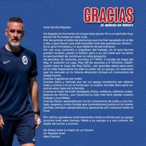 Comunicado oficial del Rayo Majadahonda: Ya entrada la tarde, tanto el Rayo Majadahonda como el propio entrenador (ver imagen) remitían sus tradicionales comunicados. «Abel Gómez y su cuerpo técnico no continuarán en el CF Rayo Majadahonda. Desde nuestro club les deseamos la mejor de las suertes en sus nuevas etapas profesionales y personales. El CF Rayo Majadahonda informa que Abel Gómez y su cuerpo técnico no continuarán al mando del primer equipo para la temporada 2022-2023. Tras 50 encuentros desde marzo de 2021, Abel deja un balance de 26 victorias, 6 empates y 18 derrotas además del ascenso a Primera RFEF y el acceso a la promoción a Segunda División. Durante la temporada recientemente finalizada, nuestro club eliminó al CD Eldense y Málaga CF para clasificarse por primera vez a los dieciseisavos de Copa del Rey que nos enfrentó ante el Atlético de Madrid. En el campeonato liguero finalizamos la temporada en cuarta posición con un total de 62 puntos que se repartieron en 19 victorias, 5 empates y 14 derrotas. Tras la gran campaña realizada nuestro primer equipo accedió a los play-off de ascenso a LaLiga Smartbank ante el Albacete Balompié, recientemente ascendido, en el Estadio de Balaídos en Vigo. Desde nuestro club agradecemos a Abel Gómez, Salva Romero y Manolo Salado el excelente trabajo realizado. Asimismo, les deseamos la mejor de las suertes y los mayores éxitos profesionales y personales para el futuro».