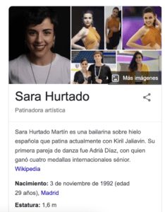 LIDIA GARCIA. Conmoción en el mundo del hielo y portadas de impacto en toda la prensa deportiva española: Sara Hurtado, la patinadora de Majadahonda/Las Rozas, se retira. Lo ha hecho público este lunes 30 de mayo (2022) con estas palabras: «No negamos que es una decisión dura, pero al igual que es importante saber cuándo empujar un poco más, también es importante reconocer cuándo parar y nuestro momento es ahora», aseguran Hurtado y su pareja artística, el ruso Kirill Jalyavin, en su despedida. Y añaden: «Nos vamos orgullosos de cómo hemos afrontado cada reto, de cómo nos hemos vaciado en cada entrenamiento y también muy satisfechos por todo lo que hemos conseguido por el camino». «Sara, que comenzó a patinar con 8 años en la Escuela de Majadahonda ‘La Nevera’, formó junto a Adrián Díaz la primera pareja española de danza sobre hielo, una categoría inexistente en nuestro país que la Federación tuvo que inventar con la ayuda de la contratación del entrenador británico John Dull. Sara comenzó a patinar a los 8 años cuando su madre, Pilar Martín, la apuntó a la Escuela de patinaje de Majadahonda ‘La Nevera’.