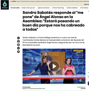 LA PERIODISTA SANDRA SABATÉS (LA SEXTA) RESPONDE AL «ME PONE» DE ÁNGEL ALONSO EN LA ASAMBLEA: «Estará pasando un buen día porque nos ha cabreado a todas». Sandra Sabatés y Cristina Gallego presentan un nuevo carrusel de ‘machistadas’ donde destaca el impresentable comentario del diputado del PP en la Asamblea de Madrid, Ángel Alonso, asegurando que «ver así a los de Más Madrid me pone». En una nueva edición de ‘Goles son señores’, Sandra Sabatés y Cristina Gallego arrancan su ‘carrusel de machistadas’ por la Asamblea de Madrid. Allí, el diputado del PP Ángel Alonso se dirigía a la portavoz de Más Madrid, Manuela Bergerot, asegurando que «ver así a los de Más Madrid a mí me pone». Unos términos impresentables que para la diputada es «violencia política». «Si le pone que se enfaden con él debe estar pasando un día genial, porque nos ha cabreado a todas», comenta Sandra, mientras que Cristina pide ‘BAR’, para que Alonso «se acode mientras se toma una copa de cognac», señalan en La Sexta.
