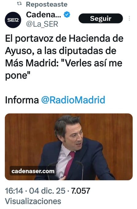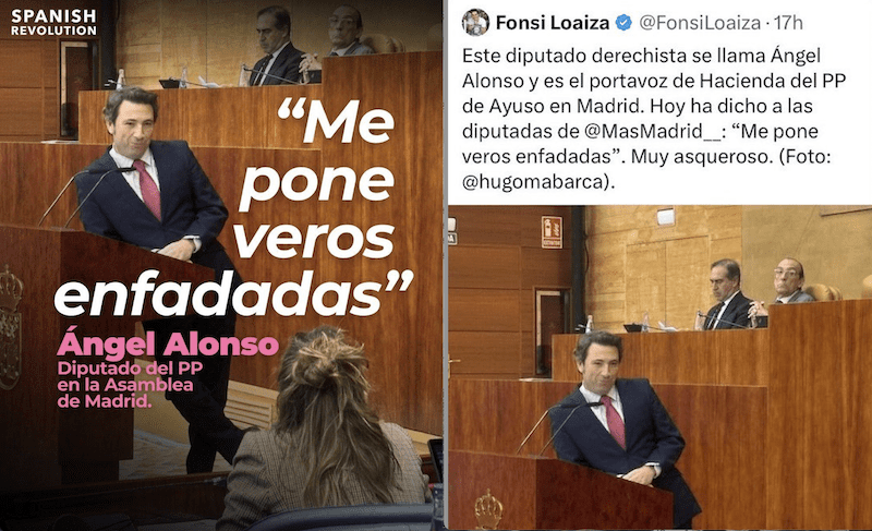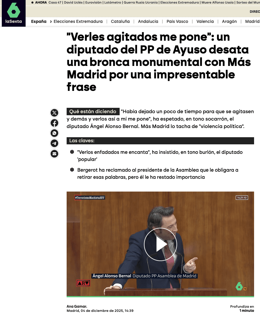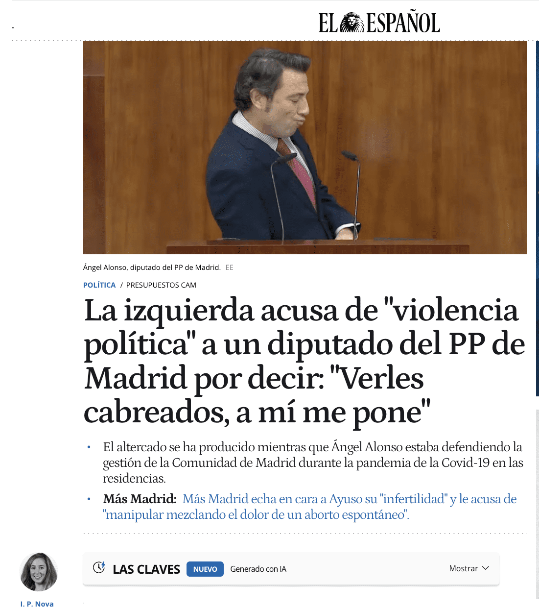 MARIANA BENITO. (Majadahonda, 6 de diciembre de 2025). Titulares en la prensa, programas y noticias en radio y televisión, las redes sociales echando humo… El ex concejal del PP en el Ayuntamiento de Majadahonda y ahora diputado en la Asamblea de Madrid, Angel Alonso, ha tardado «solo» 2 años en hacerse famoso en su nuevo puesto en la política regional. Y ha sido precisamente por su oratoria, lo más valorado en la política municipal, pero esta vez le ha jugado una mala pasada. El hecho sucedió este jueves 4 de diciembre cuando se debatían los Presupuestos regionales y Angel Alonso le respondió a la diputada de Más Madrid, Manuela Bergerot, que «le pone» verla enfadada, a ella y a todo su grupo parlamentario, cuando responden con algaradas desde sus escaños a sus discursos, a lo que la parlamentaria respondió que decir eso era «violencia política» contra las mujeres. Y aunque Angel Alonso explicó que «le pone» quiere decir «me gusta», lo cierto es que la Oposición ha querido ver en la metáfora erótica una alusión de carácter sexual, lo que ha desatado ya una torrentera de comentarios y viñetas en las redes sociales, algunas de ellas con mucho humor. La frasecita ha hecho fortuna, pues ha sido recogida por radios como Onda Cero y la Cadena SER, televisiones como La Sexta y periódicos como El Español, El Periódico de España, Infobae o Soy de Madrid, entre otros muchos. Y este es un resumen de ellos.