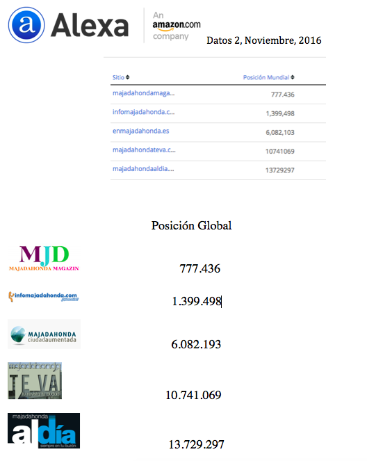 Alexa: certifica que el nº 1 en Majadahonda es MJD Magazin, que está dentro del primer millón de páginas más vistas en el mundo, concretamente ocupa el puesto 777.436. Hay que advertir que en el planeta en 2017 se romperá la barrera de los 1000 millones de webs activas. En menos de dos años de existencia, doblamos a nuestro segundo competidor (Infomajadahonda) y sacamos casi un 900% al tercero (Majadahonda Ciudad Aumentada). La distancia con el cuarto (Majadahonda Te Va) y el quinto (Majadahonda al Día) es sideral. Además, MJD Magazin es el único multimedia, el único que es diario, el único que hace información y no solo publica notas de prensa oficiales y el único que no es solo una plataforma comercial sino que elabora noticias. WordPress certifica que 3.507 en menos de dos años, 40 noticias a la semana y 7 al día, con una edición deportiva y cultural de fin de semana. Y todas solo y exclusivamente de Majadahonda.