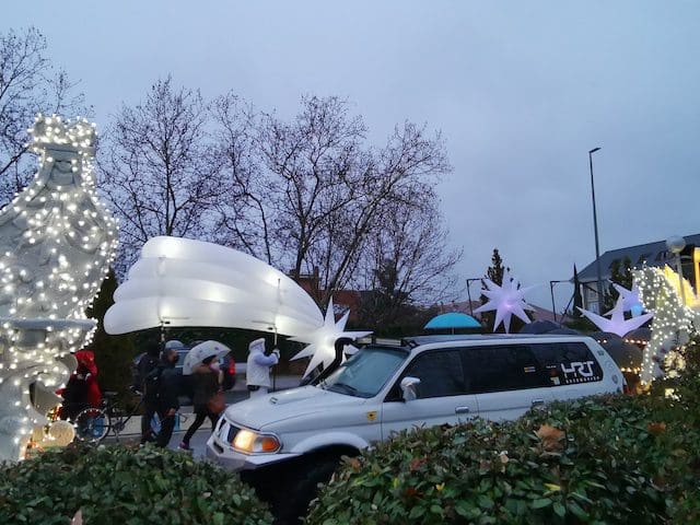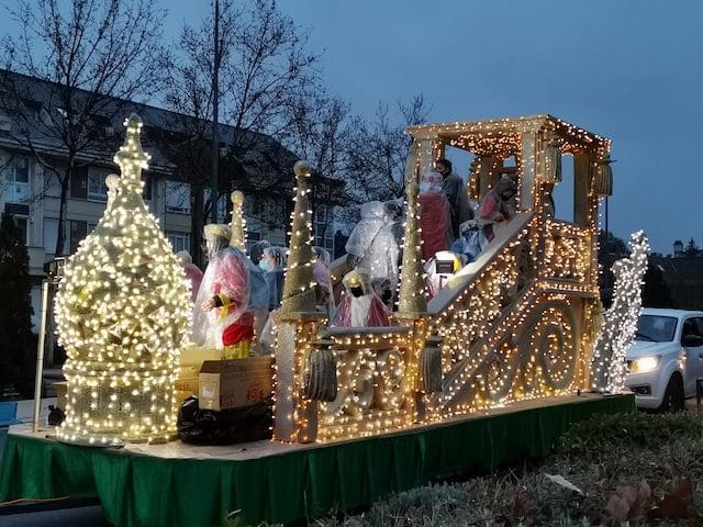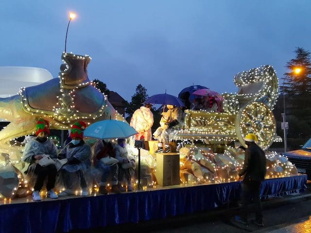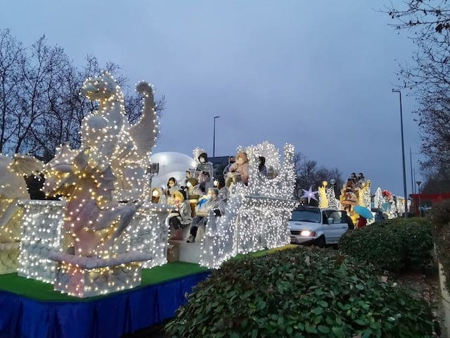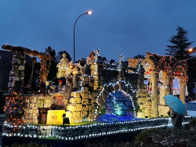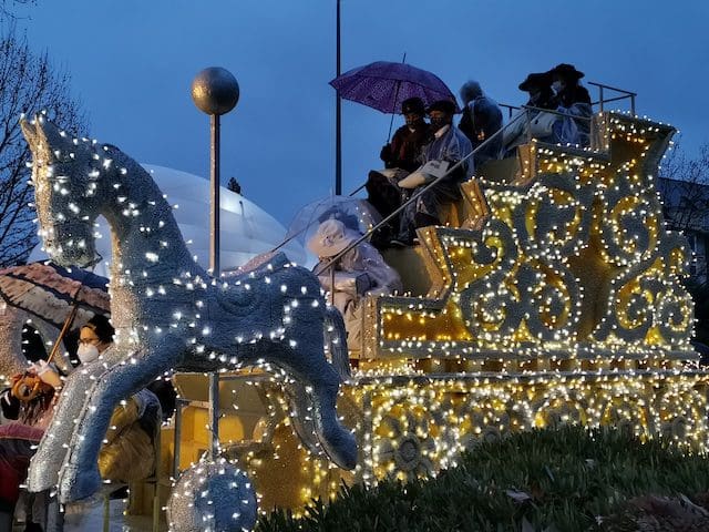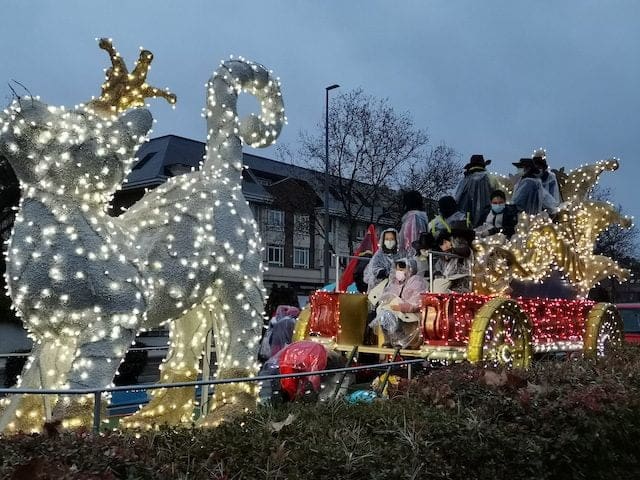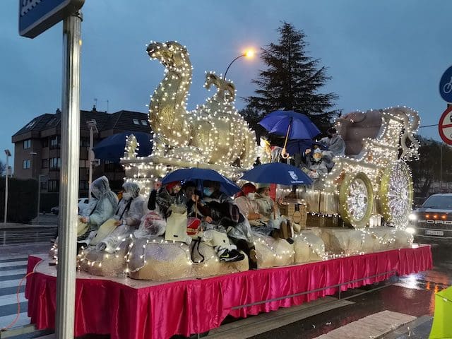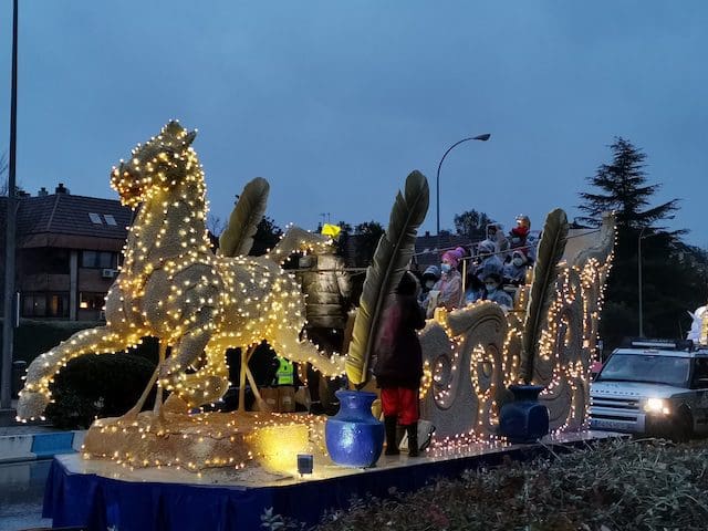 JULIA BACHILLER. A las 18:00 horas de este 5 de enero de 2022 arrancaba nuestro municipio vecino de Las Rozas con su Cabalgata de Reyes desde la carretera que une estas dos localidades, lugar cercano donde media hora después comenzaría la de Majadahonda. Como todos los asistentes pudieron comprobar, la climatología adversa de frío y lluvia no obstaculizaron que esta se llevara a cabo. Elegantes carrozas con luces destellantes, en las cuales predominaba el color blanco, y con una temática basada en la literatura infantil, aguardaban para iniciar su recorrido, y con ello trasmitir a pequeños y mayores la ilusión que despierta la llegada de los Reyes Magos. Tan solo con presenciar el arranque de la comitiva que acompañaría en su recorrido a los Magos de Oriente en Las Rozas se auguraba un gran éxito. La atenta mirada de unos padres, que bajo el paraguas no podían ocultar su preocupación por la incesante lluvia que caía sobre sus hijos, ya ubicados en las carrozas, se veía compensada con las caras de emoción que estos pequeños mostraban al formar parte de este mágico evento. Cabe destacar la gran labor de los organizadores, los cuales minutos antes de dar comienzo se preocupaban de informar de su cometido a los participantes, ubicándolos en sus lugares correspondientes.