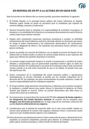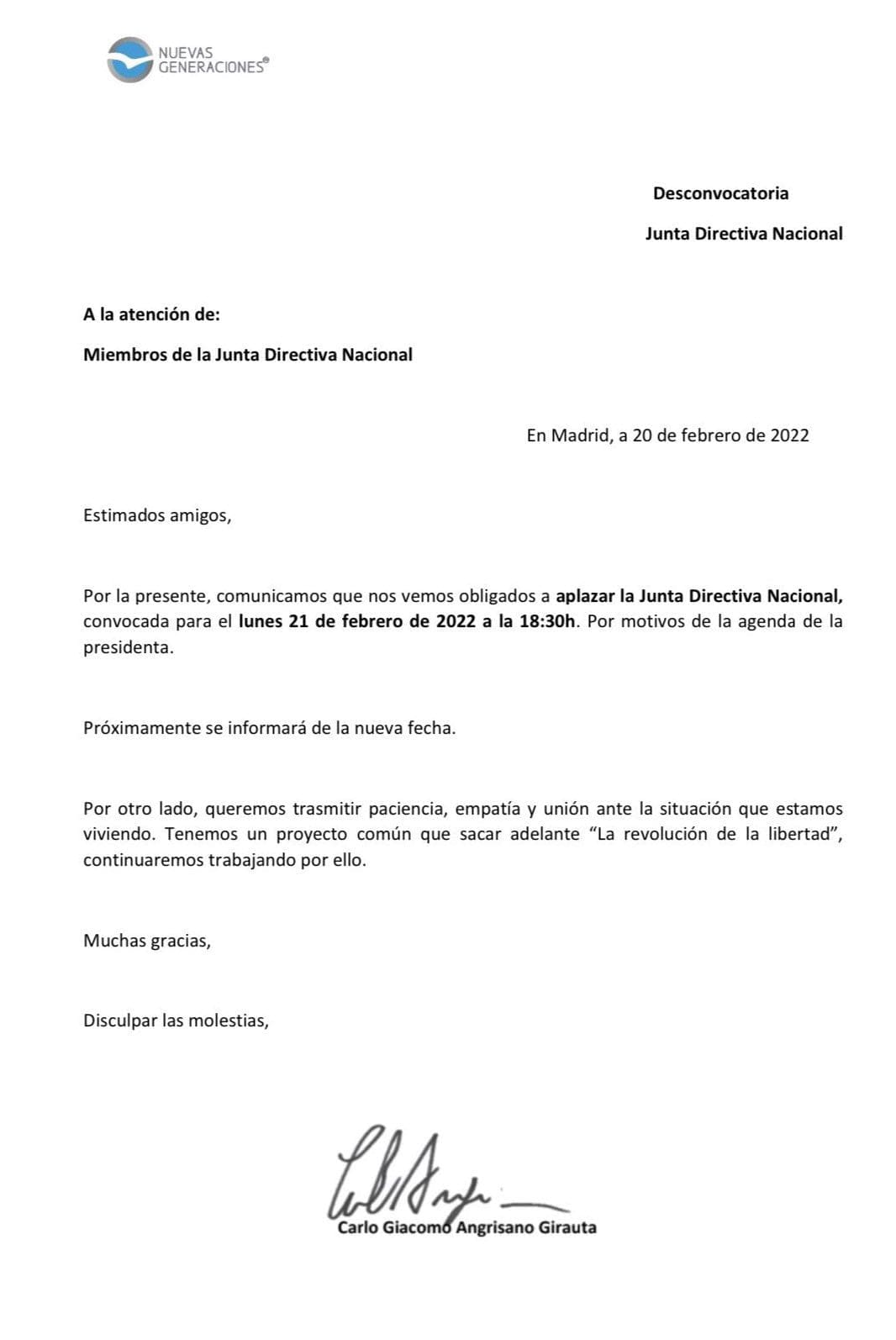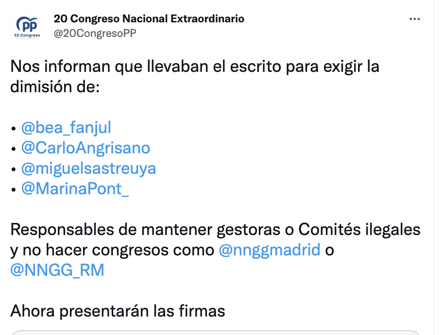En un mensaje difundido el sábado 19 de febrero, víspera de la masiva manifestación que tuvo lugar en la calle Génova en favor de la presidenta madrileña Isabel Ayuso, este grupo de militantes y cargos afines a la presidenta madrileña anunció que lo mismo que está ocurriendo a nivel nacional en Génova 13 lo solicitan para Nuevas Generaciones: «esta semana vamos a presentar los vocales que formamos parte de la Junta Directiva la solicitud de convocatoria de urgencia para convocar los Congresos del Partido, para la Elección de la Presidencia del Partido, de los vocales del Comité Ejecutivo y de la Junta Directiva«. La controvertida gestión de Marina Pont en Nuevas Generaciones en imágenes (pinche en ellas para aumentar su tamaño):