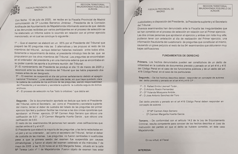 «DENUNCIAS DE VARIOS PARTICIPANTES». Con fecha 10 de julio de 2025 se recibe en la Fiscalía Provincial de Madrid comunicación de Lourdes Barranco Jiménez, Presidenta de la Comisión Antifraude del Ayuntamiento de Majadahonda, informando acerca de que debido a las denuncias recibidas por varios participantes en el proceso de selección se ha elaborado un Informe sobre lo ocurrido en relación con el primer ejercicio mencionado, en el cual se concluye lo siguiente: 1º. Que el examen se elaboró en un 95% por el Presidente del Tribunal que preparó las 80 preguntas más las 5 alternativas y las propuso al resto de los miembros del Tribunal, aunque deberían haberlas realizado entre todos ellos. Solamente a requerimiento de éstos, el presidente introdujo 3 de las que se propusieron por los otros miembros del Tribunal. Las preguntas se encontraban en el ordenador del presidente y en una memoria externa que se encontraba en su poder cuando las aporta a la primera reunión del Tribunal. 2º. El nombramiento del Presidente se produjo el día 13 de marzo de 2025 y reconoció ante los demás miembros del Tribunal que las había preparado dos meses antes de ser designado. 3° El examen se suspendió el día del primer señalamiento debido al apagón nacional y se celebró días más tarde, sin que haya quedado clara la cadena de custodia de los archivos de las preguntas, siendo responsabilidad del Presidente y el Secretario y Secretaria suplente la custodia segura de dichos archivos. 4°.– El proceso de selección no fue “todo lo ortodoxo» que debía ser.