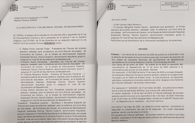 Mª LUISA MORANDO MARTINEZ. Fiscal Investigador. (Diligencia de Investigación Penal). A la Sección Civil y de Instancia. Decana de Majadahonda. El Fiscal formula denuncia contra Rafael Emilio Lleonart Torán, Presidente del Tribunal del proceso selectivo realizado para la cobertura por turno libre de 2 plazas de Funcionario de Carrera, en la Escala de Administración Especial, Subescala Técnica, Técnico Superior, denominación Arquitecto, grupo A, subgrupo A1, nivel 26 del Ayuntamiento de Majadahonda. Antonio Rosón Fernandez, Secretario del Tribunal. Yolanda Mosquera Ambite, Directora de Recursos Humanos, y secretaria suplente. Jose Antonio Sanchez del Toro, Presidente suplente, plazas convocada según las Bases aprobadas por la Junta de Gobierno Local el 13 de diciembre de 2024, toda vez que pudieran haber dado información de las preguntas del primer ejercicio tipo test a las únicas dos personas que aprobaron el ejercicio, así como contra Mª Carmen Alejo Serrano y Carmen Margarita Huerta García, opositoras que aprobaron el Primer ejercicio, particulares que se beneficiaron de la información facilitada por los anteriores.