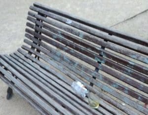 Vidrio y resto de comida en un banco público