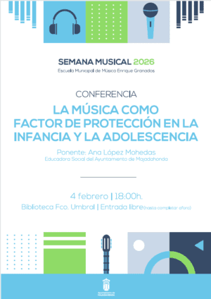 MIÉRCOLES: Conferencia “La música como factor de protección en la infancia y en la adolescencia»: Miércoles de 18:00 a 19:00 horas (Biblioteca Francisco Umbral). Ana López Mohedas, Educadora Social del Ayuntamiento de Majadahonda. Clase abierta de Canto y Repertorio: Miércoles de 18:30 a 21:30 horas (Aula 5). Profesora Nora Usterman. Ensayo Puertas Abiertas Coro Juvenil: Jueves de 18:30 a 20:00 horas (Sala Polivalente 1 de la Casa Cultura). Profesores Aiblín Brito y Carlos Puga. El miércoles 4 de febrero, Ana López Mohedas, educadora social del Ayuntamiento de Majadahonda, impartirá otra conferencia, en este caso sobre “La música como factor de protección en la infancia y adolescencia”. Se celebrará a partir de las 18 horas en la Biblioteca Municipal “Francisco Umbral”, con entrada libre hasta completar aforo. PROGRAMA COMPLETO: Taller Flauta + Guitarra – 3ºA y 3ºB Música y Movimiento – De 17:30 – 18:30 horas (Aula Música y Movimiento). Prof.es Raquel Ávila, Jordi Calafell y David Burgos. Audiciones alumnos – De 17:30 – 18:30 horas (Salón Actos Auditorio). Conferencia “La música como factor de protección en la infancia y en la adolescencia»- De 18:00 – 19:00 horas (Biblioteca Francisco Umbral). Ana López Mohedas, Educadora Social del Ayuntamiento de Majadahonda. Taller Flauta + Guitarra – 4ºA y 4ºB Música y Movimiento – De 18:30 – 19:30 horas (Aula Música y Movimiento). Prof. .es Raquel Ávila, Jordi Calafell y David Burgos. Clase abierta de Canto y Repertorio – De 18:30 – 21:30 horas (Aula 5). Prof.ª Nora Usterman y Luis Ricoy. Taller cuidado básico y limpieza viento metal – De 18:30 – 19:30 horas (Aula 13). Prof. Miguel Ángel Fernández. Taller Efectos Contemporáneos de la Flauta Travesera – De 20:00 – 21:00 horas (Aula 11). Prof. Jordi Calafell. Audiciones alumnos – De 20:00 – 21:00 horas (Salón Actos Auditorio).