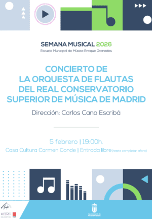 JUEVES: Ensayo Abierto Encuentro Bandas: Jueves de 19:00 a 21:00 horas (Salón Actos Auditorio). Bandas Conservatorio Majadahonda, Las Rozas y Majadahonda). Profesores Juan Manuel Colino, Ramón Escrich y Miguel Fernández. La Semana Musical de Majadahonda cuenta este año con la participación del Real Conservatorio Superior de Música de Madrid, cuya Orquesta de Flautas ofrecerá un concierto el jueves 5 de febrero en el Teatro de la Casa de la Cultura “Carmen Conde”. Comenzará a las 19 horas, con la dirección de Carlos Cano Escribá, y, como en el resto de actividades, el acceso será gratuito hasta completar aforo. PROGRAMA COMPLETO: Taller Flauta + Guitarra – 3ºC y 3ºD Música y Movimiento – De 17:30 – 18:30 horas (Aula Música y Movimiento). Prof.es Raquel Ávila, Jordi Calafell y David Burgos. Audiciones alumnos – De 17:30 – 18:30 horas (Salón Actos Auditorio). Taller Afinación en la Orquesta – De 17:30 – 18:30 horas (Aula 13). Prof. Miguel Román. Taller Flauta + Guitarra – 4ºC, 4ºD y 4ºE Música y Movimiento – De 18:30 – 19:30 horas (Aula Música y Movimiento). Prof.es Raquel Ávila, Jordi Calafell y David Burgos. Ensayo Puertas Abiertas Coro Juvenil – De 18:30 – 20:00 horas (Sala Polivalente 1- Casa Cultura). Prof.es Aiblín Brito y Carlos Puga. Taller cuidado básico y limpieza viento metal – De 18:30 – 19:30 horas (Aula 13). Prof. Miguel Ángel Fernández. Concierto Orquesta Flautas RCSMM – De 19:00 – 20:00 horas (Teatro Casa Cultura). Dirección: Carlos Cano. Ensayo Abierto Encuentro Bandas – De 19:00 – 21:00 horas (Salón Actos Auditorio). Bandas Conservatorio Majadahonda, Las Rozas y Majadahonda). Prof.es Juan Manuel Colino, Ramón Escrich y Miguel Fernández. Audiciones alumnos – De 20:00 – 21:00 horas (Aula 5).