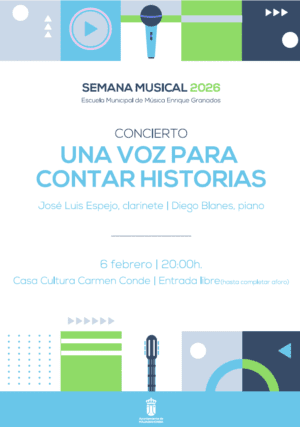 VIERNES. Conferencia “Manuel de Falla, tradición y contradicción”: Viernes de 17:30 a 19:00 horas (Aula 11). Profesor Raúl Barrio. Segunda sesión: El amor brujo, El retablo de maese Pedro y Fantasía baética. Concierto clausura “Una voz para contar historias”: Viernes de 20:00 a 21:00 horas (Teatro Casa Cultura). José Luis Espejo (clarinete) y Diego Blanes (piano). «El viernes 6 de febrero, José Luis Espejo, al clarinete, y Diego Blanes, al piano, ofrecerán el concierto “Una voz para contar historias”, en el Teatro de la Casa de la Cultura. La cita es a las 20 horas, con entrada libre hasta completar aforo. La concejala de Cultura, Nuria Wilde, ha puesto en valor esta Semana Musical de Majadahonda porque “durante varios días, los vecinos de la ciudad tienen la posibilidad de saber más sobre un lenguaje universal, que nos hace más humanos, promueve el desarrollo de las personas y refuerza los lazos de la comunidad y, también, entre generaciones. No cabe duda de que, la música, nos hace más felices”. PROGRAMA COMPLETO: Audiciones Grupos Cámara y Orquesta Flautas – De 17:30 – 18:30 horas (Salón Actos Auditorio). Profesores Isabel Gil, Miguel Román y Jordi Calafell. Conferencia “Manuel de Falla, tradición y contradicción” – De 17:30 – 19:00 horas (Aula 11). Prof. Raúl Barrio. Segunda sesión: El amor brujo, El retablo de maese Pedro y Fantasía baética. Concierto clausura “Una voz para contar historias” – De 20:00 – 21:00 horas (Teatro Casa Cultura). José Luis Espejo (clarinete) y Diego Blanes (piano).