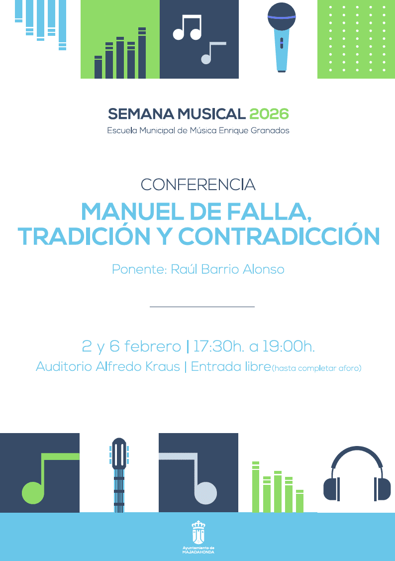 VIERNES. Conferencia “Manuel de Falla, tradición y contradicción”: Viernes de 17:30 a 19:00 horas (Aula 11). Profesor Raúl Barrio. Segunda sesión: El amor brujo, El retablo de maese Pedro y Fantasía baética. Concierto clausura “Una voz para contar historias”: Viernes de 20:00 a 21:00 horas (Teatro Casa Cultura). José Luis Espejo (clarinete) y Diego Blanes (piano). «El viernes 6 de febrero, José Luis Espejo, al clarinete, y Diego Blanes, al piano, ofrecerán el concierto “Una voz para contar historias”, en el Teatro de la Casa de la Cultura. La cita es a las 20 horas, con entrada libre hasta completar aforo. La concejala de Cultura, Nuria Wilde, ha puesto en valor esta Semana Musical de Majadahonda porque “durante varios días, los vecinos de la ciudad tienen la posibilidad de saber más sobre un lenguaje universal, que nos hace más humanos, promueve el desarrollo de las personas y refuerza los lazos de la comunidad y, también, entre generaciones. No cabe duda de que, la música, nos hace más felices”. PROGRAMA COMPLETO: Audiciones Grupos Cámara y Orquesta Flautas – De 17:30 – 18:30 horas (Salón Actos Auditorio). Profesores Isabel Gil, Miguel Román y Jordi Calafell. Conferencia “Manuel de Falla, tradición y contradicción” – De 17:30 – 19:00 horas (Aula 11). Prof. Raúl Barrio. Segunda sesión: El amor brujo, El retablo de maese Pedro y Fantasía baética. Concierto clausura “Una voz para contar historias” – De 20:00 – 21:00 horas (Teatro Casa Cultura). José Luis Espejo (clarinete) y Diego Blanes (piano).
