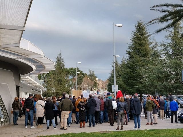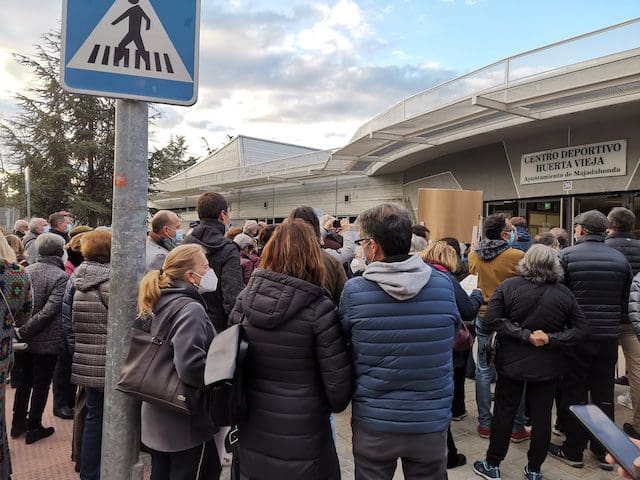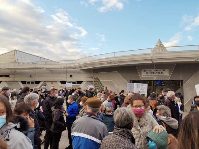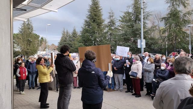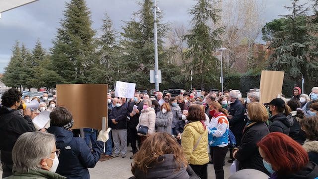 JULIA BACHILLER. Por tercera ocasión los vecinos y usuarios del Polideportivo Huerta Vieja se manifestaron este viernes 4 de marzo (2022) para solicitar la paralización de la demolición de estas instalaciones que albergan la piscina municipal. En esta ocasión, en la que la concentración fue más numerosa, lo hicieron frente al propio polideportivo, situado en la avenida de Guadarrama 36 de Majadahonda. Y tal como estaba previsto, a las 18:00 horas se dieron cita numerosos afectados por esta decisión tomada por el Gobierno municipal PP-Vox ante el deterioro de la infraestructura deportiva, aunque contradiciendo las indicaciones de los dos informes, externo e interno, elaborados por los especialistas. Una vez más cabe destacar la compostura guardada por los asistentes durante la concentración, aunque en esta ocasión, al tratarse de un lugar alejado del centro de la ciudad, se profirieron lemas como “¡Huerta Vieja no se tira!”, “¡Rehabilitación y no demolición!”, “¡Menos flores y más bañadores!”, eludiendo en todo momento mencionar a un partido político en concreto. Similar actitud se mantuvo al leer el manifiesto que a continuación publicamos. Como prólogo a la lectura del texto intervino la vecina y usuaria de las instalaciones Pepa Iglesias Ponce de León, que con su implicación en solucionar esta situación, sus dotes de oradora y su carácter afable, se ha convertido espontáneamente en un referente para los afectados. De su intervención en esta ocasión destacaremos su agradecimiento a la presencia de los asistentes y su frase final “Esto es Majadahonda, esta es nuestra piscina, y hay que respetarla”. Seguidamente Carlos Peña (Club Fénix Majadahonda de Natación) dio lectura al siguiente manifiesto: