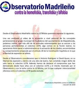 ¿Como lograron los dos concejales de Cs Majadahonda que el Observatorio Madrileño contra la LGTBfobia y Arcópoli (son 2 organizaciones que actúan en paralelo) les «absolviera» de una denuncia que ambas instituciones habían formulado previamente? Ahí está el enigma, pero fuentes cercanas al caso señalan que al haberse producido una contraprestación económica entre ambas partes todo podría cobrar sentido. Lo que sí parece claro es que, a pesar de la división de opiniones sobre la transcendencia estética y artística del asunto, hay práctica unanimidad en que hubo mofa o befa homófoba de los dos ediles, con o sin intención, pues se trataba de una parodia sobre los homosexuales. De hecho, en la nota que esgrimen los 2 concejales, el «Observatorio» justifica su actitud con el argumento de que «estereotipar a los gays es algo común en la ficción teatral».