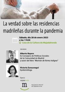 FELIX PEDROCHE. «La verdad sobre las residencias madrileñas durante la pandemia» fue la presentación y debate que se celebró este sábado 28 de enero (2023) en la Casa de la Cultura de Majadahonda. Organizado por la Asociación Vecinal de Majadahonda, acudieron la epidemióloga Victoria Zunzunegui y Alberto Reyero, ex consejero de Políticas Sociales de la Comunidad de Madrid y autor del libro «Morirán de forma indigna«. Acudí a una Sala que se muestra otra vez con aforo insuficiente, como ya ocurrió en el debate anterior sobre la Sanidad Pública. No se entiende por parte de los asistentes cómo no se pone a disposición del evento el Salón de la Casa de la Cultura, o mejor sí que se entiende, conociendo el proceder habitual de este alcalde contra sus vecinos, a quienes intenta amordazar no sólo en el Pleno, sino también dificultando la asistencia a los eventos que organiza la Asociación Vecinal. El ex-consejero de Políticas Sociales expone como se desarrollaron los acontecimientos ante el inicio de la pandemia Covid-19: el consejero de Sanidad sacó una medida para medicalizar las residencias de la 3ª Edad el 19.03.20 y reconoce que se trató de una iniciativa muy acertada, pero se estableció un protocolo de exclusión para personas mayores para evitar que colapsaran los hospitales, algo discriminatorio.