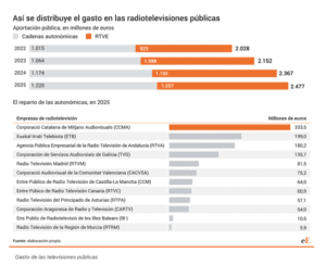 El gasto público en RTVE y las televisiones autonómicas en España ha alcanzado un récord histórico de aproximadamente 2.500 millones de € anuales a primeros de 2026, tras un aumento del 22% en 3 años. RTVE supera los 1.220 millones de €, mientras que el conjunto de las autonómicas supera los 1.257 millones, destacando TV3 (Cataluña) con presupuestos superiores a 340 millones de €. (Fuente: El Economista)