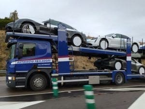 EL CONCESIONARIO DE MAJADAHONDA, «PRIMERA REMESA DE ENVÍO DESDE ALEMANIA». «Avistamos en las carreteras de la Comunidad de Madrid un camión con varias unidades de producción del Porsche Taycan. Sabíamos que había varias unidades del Porsche Taycan en Madrid gracias a la publicación que Tomás Villén, CEO de Porsche Ibérica, había realizado en su perfil público de Twitter. Pero, al o a los los ejemplares matriculados en Alemania se podrían unir los que esta mañana hemos podido fotografiar en el entorno de uno de los concesionarios de la firma situados en la zona noroeste de la Comunidad de Madrid. Las expectativas de la firma de Stuttgart para con este modelo, el primero eléctrico 100 por 100, han superado todas las previsiones y, de hecho, desde la cúpula directiva se muestran, incluso sorprendidos», señala el periodista. Ahora queda por conocer la fecha en que las primeras entregas a los particulares que procedieran a efectuar la reserva de uno de ellos comiencen a ser efectuadas por lo que, los Porsche Taycan vistos en Majadahonda «bien pudieran ser parte de esta primeras remesas de envíos desde la fábrica situada en la localidad de Zuffenhausen», concluye.