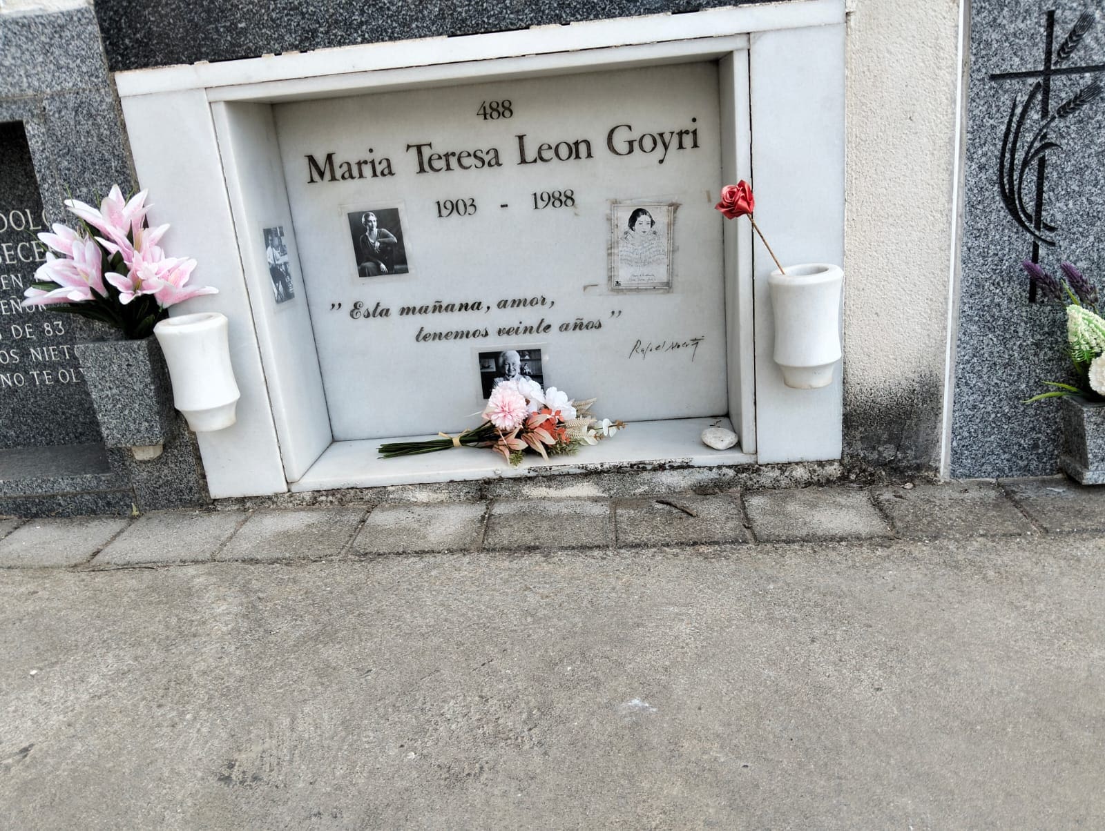 «En cuanto a María Teresa León, ahí en su nicho, con ese verso que tiembla en mis adentros: “Esta mañana, amor, tenemos veinte años”, del inmenso Rafael Alberti, su marido».