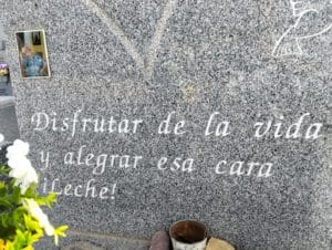 He visitado en el curso de mi larga vida cementerios famosos como La Recoleta en Buenos Aires para honrar la memoria de la inteligente y apasionada mujer que fue Eva Duarte; Yo creo en la supervivencia del espíritu y tengo asumida la muerte de la materia, sin dramas, que sabemos que es cosa de un ciclo más o menos largo pero inexorable. Y me uno a la dama de tu lápida: Vive bien y alegra esa cara, leche!!!