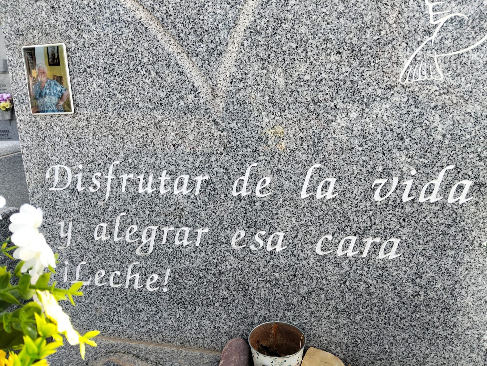 «Espigando entre las tumbas hallé joyas como esa lápida en la que una dama, bien jacarandosa, nos anima con un rotundo: “Disfrutar de la vida y alegrar esa cara ¡Leche!”