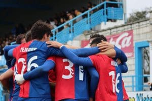 Celebración del gol de Diego Núñez con el Rayo Majadahonda ante el Coria, en su tercer partido disputado con la camiseta rayista