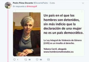 Precisamente, las denuncias falsas son uno de los argumentos que con más fuerza se esgrimen en este debate alrededor de la violencia de género entre los que piden su derogación. A las últimas declaraciones de Andrés Herzog sobre esta cuestión se ha sumado la posición que tiene sobre este tema la letrada de Majadahonda, Yobana Carril, cuyo despacho de abogados está especializado en «denunciar y proteger de la violencia que sufren los hombres a manos de sus mujeres». La abogada ha sido a lo largo de estos últimos años una de las voces más críticas sobre este tipo de legislación llegando a afirmar que «un país en el que los hombres son detenidos sin más indicio que la declaración de una mujer no es un país democrático» y ha calificado la Ley Integral de Violencia de Género como «un insulto al derecho». Preguntada por estas cuestiones por MJD Magazin, Carril afirma: «Todos sabemos distinguir perfectamente entre un juego de seducción y un acoso; lo que no podemos hacer es demonizar las relaciones entre hombres y mujeres. Las feministas suelen responder de forma radical» y que «en Majadahonda hay hombres maltratados y que han sufrido denuncias falsas, a fin de evitar la custodia compartida de los hijos en común«.