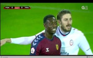 En efecto, tal es la racanería futbolística del Rayo Majadahonda, que los visitantes no chutaron ni una sola vez a portería, mientras que el Pontevedra, muy superior a lo largo de los 90 minutos, ya avisaba en el minuto 3 con una preciosa chilena de Adighibe desde el borde del área. Ni la perspectiva de estar luchando por el espacio del play off (el Pontevedra es 6º, a solo 1 punto del Rayo, 4º), estimulaba algo el insulso juego visitante, que tiraba de los recursos habituales: lanzamiento largo de Jean Jules para que el incansable Mesa tratara de pararlo e intentara una jugada de peligro. Pero todo era un vano intento ya que el Pontevedra, bien plantado en el terreno de juego, presionando la salida del balón de los rayistas, consiguió los dos goles al final de la primera parte. En el minuto 40, Bustos aprovechó un centro desde la izquierda y remató a puerta vacía después de que el balón recorriera toda el área pequeña visitante sin que ninguno de los defensas metiera el pie para sacar el esférico. Fallo garrafal de coordinación de la superpoblada defensa majariega que se repitió apenas tres minutos más tarde, cuando tras un centro también desde la izquierda se quedara completamente solo Alex Fernández para marcar de nuevo a placer, bajo la atenta y perdida mirada de los Pulido y Valentín.