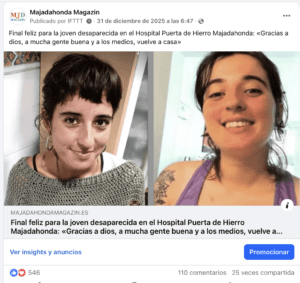 MARIANA BENITO. (11 de enero de 2026). Dos noticias de MJD Magazin han alcanzado el primer récord de audiencia del año 2026 gracias a las visitas y los comentarios de los lectores, que además han compartido o rebotado los enlaces a las mismas a través de redes sociales y «wasap». Una de las noticias era positiva y se titulaba: «Final feliz para la joven desaparecida en el Hospital Puerta de Hierro Majadahonda: «Gracias a dios, a mucha gente buena y a los medios, vuelve a casa», lo cual lleva originados 110 comentarios, ha sido 25 veces compartida y ha provocado 546 «Me gusta» o «Me encanta» de quienes la leyeron. La otra noticia era negativa y se titulaba «La autopsia revela que el bebé de Majadahonda arrojado a un contenedor nació vivo y con pelo tras 7,5 meses de embarazo: Fiscalía pide prisión para la madre de 19 años», la cual ha originado 48 comentarios, cuyos enlaces compartimos. Reproducimos una interesante reflexión del periodista Victor de la Serna sobre esta cuestión.