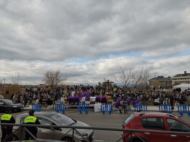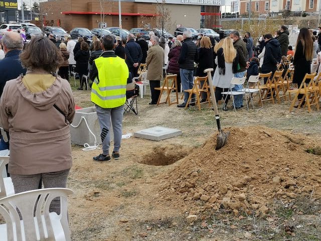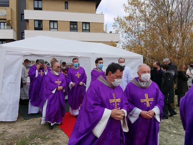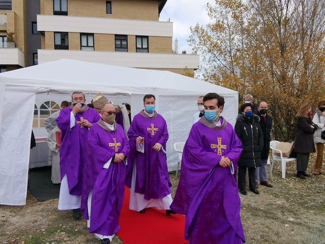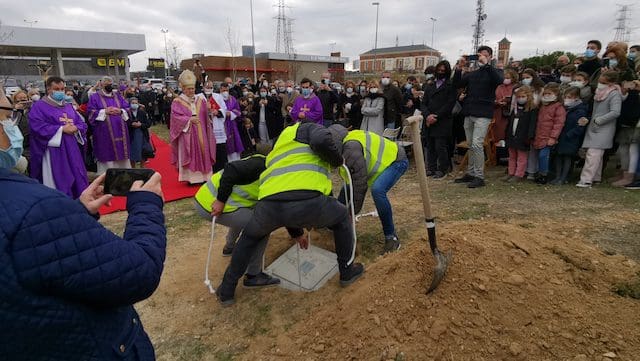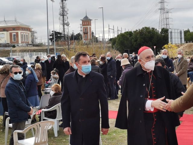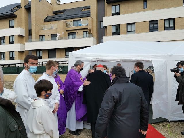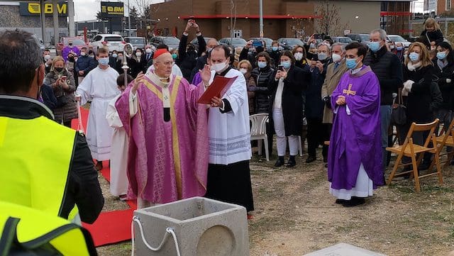 JULIA BACHILLER. El acto de bendición y colocación de la primera piedra del nuevo templo parroquial de Santa Genoveva Torres de Majadahonda tuvo lugar este domingo 19 de diciembre de 2021 en los terrenos situados entre las calles Las Bodas de Fígaro y Barbero de Sevilla. A las 13:00 horas llegaba al lugar el cardenal Carlos Osoro, arzobispo de Madrid, quien en su recorrido por la alfombra roja hasta la ocasional sacristía instalada para el evento, fue saludando afectuosamente a algunos de los asistentes que encontraba a su paso. Entre los numerosos sacerdotes que participaron en la eucaristía, cabe destacar el equipo parroquial de Santa Genoveva, con su párroco David Benítez y el padre Fernando Cárdenas, que recientemente fue trasladado a otra parroquia, el párroco y arcipreste de Majadahonda Juan Francisco Pérez, junto a sacerdotes de las cinco parroquias de Majadahonda. En su homilía, el cardenal Osoro consideró este evento como un día especial por dos motivos, como “futuro lugar del templo parroquial de esta comunidad y porque dentro de unos días vamos a celebrar la venida de nuestro Señor Jesucristo”. Seguidamente hizo referencia a la crisis sanitaria que estamos viviendo: “Esta pandemia nos ha hecho experimentar a todos nosotros esa sensación de no poder vencer algo tan sencillo y tan pequeño como es un virus, pero no lo podemos vencer. Quizás todo esto está haciendo a la humanidad entera entrar en una reflexión sobre lo que es lo más importante para todos nosotros”.