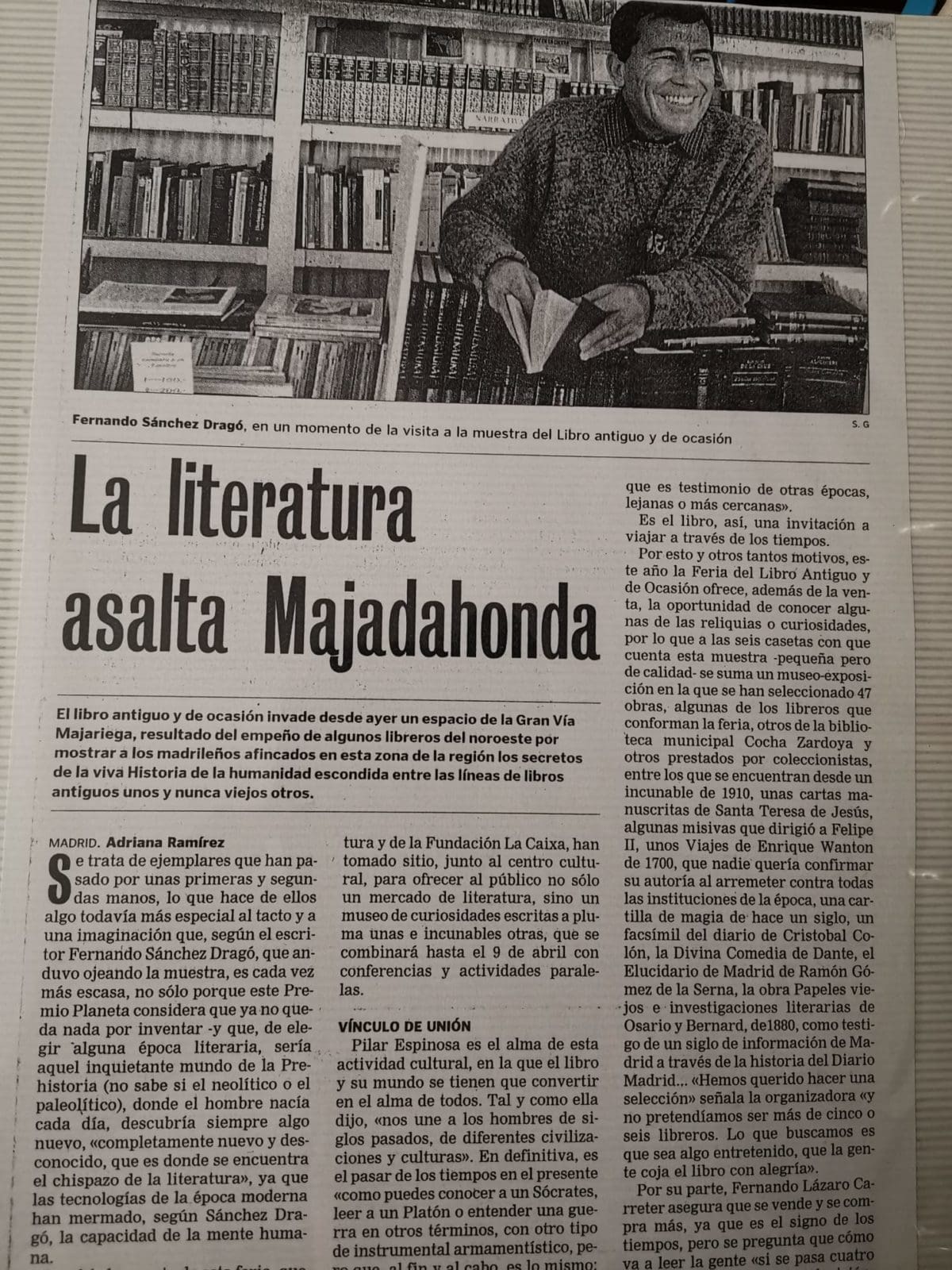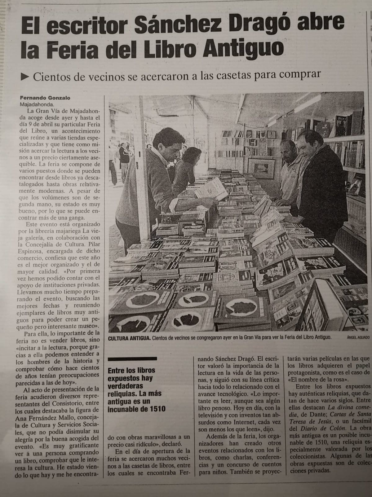 Por su parte “Diario 16”, en su publicación del 18 de marzo de 2.000, también aludía a la presencia del escritor Fernando Sánchez Dragó en el día de apertura de dicha Feria del Libro de Majadahonda. Incluso ABC, en la misma fecha, titulaba: “La literatura asalta Majadahonda” con motivo de la mencionada feria. Ahora es el Ayuntamiento quien «asalta» a los «traficantes» de libros por lo que todo ello viene a demostrar que ciertamente la celebración municipal del Día del Libro ha sido celebrada «como nunca”, ya que años antes la oferta literaria era más variada, abundante y de mayor calidad. Lea como era la Feria del Libro de Majadahonda hace 20 años (pinche la imagen para aumentarla):