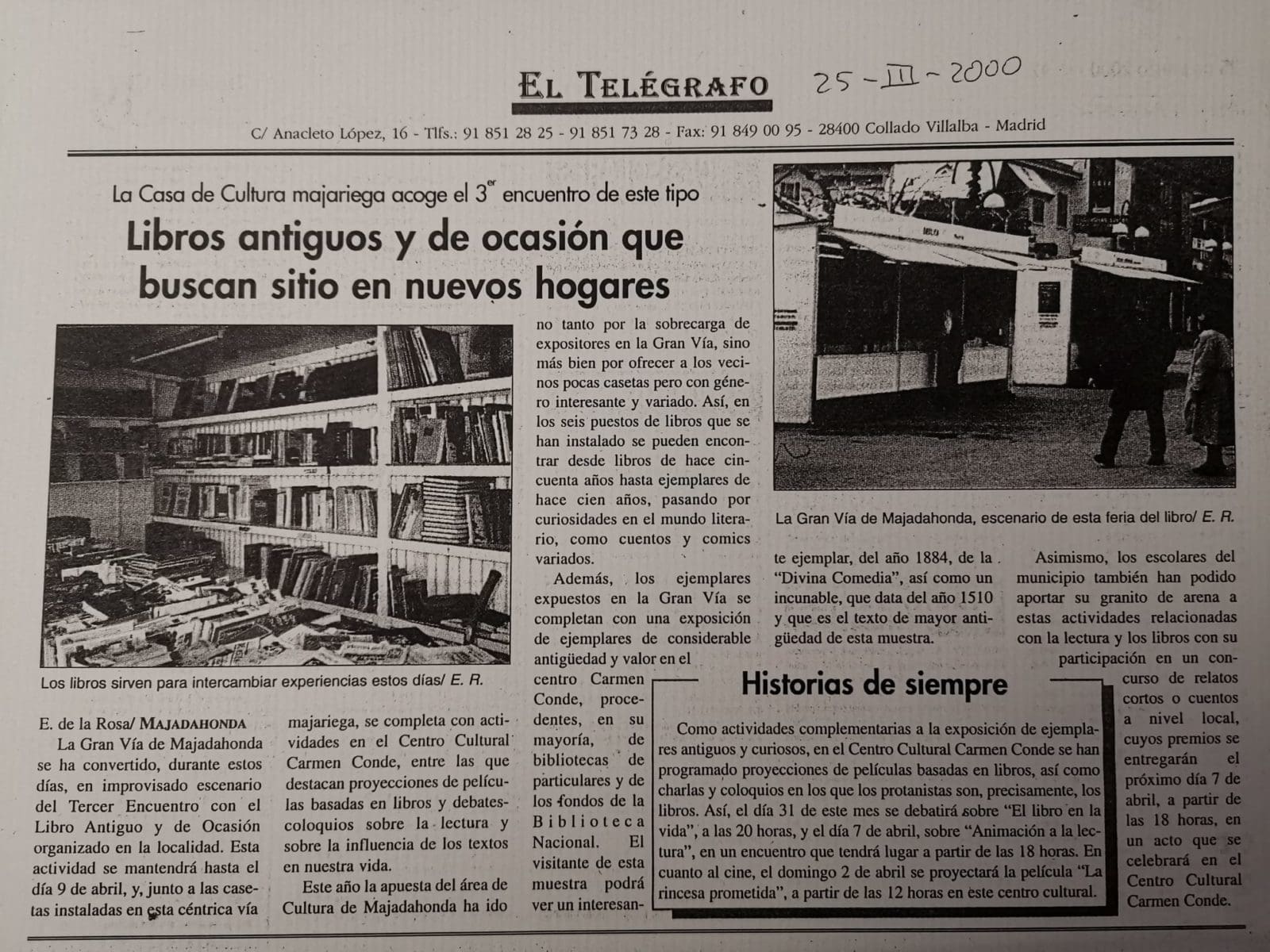 El martes 19 de abril anunciaba que “este año celebramos el Día del Libro como nunca”, y de similar manera “celebramos el Día del Libro en Majadahonda con una particular Feria del Libro en la que intercambiamos obras entre vecinos”. Además añadía que era “una cita que contará con música en directo y con la actuación de un cuentacuentos, que sin duda animará a aquellos que se acerquen desde las 11:00 de la mañana y hasta las 16:00 horas en la Plaza de Colón”, ofreciendo incluso un espacio: “puedes tener tu propio stand de venta o intercambio de libros”. ASI ERA LA FERIA DEL LIBRO DE MAJADAHONDA HACE 20 AÑOS: Si acudimos a la hemeroteca el suceso encuentra su contexto. Y se percibe el deterioro de la actividad cultural en Majadahonda, ya que encontramos que hace 22 años, el periódico “El Telégrafo” de Collado Villalba (no existían medios de comunicación locales en Majadahonda), en su publicación del 25 de marzo de 2000, daba la siguiente noticia: “La Casa de la Cultura majariega acoge el 3º encuentro de Libros Antiguos y de Ocasión que buscan sitio en nuevos hogares”. En la noticia se hace referencia a 6 casetas: “se pueden encontrar desde libros de hace 50 años hasta ejemplares de hace 100 años, pasando por curiosidades en el mundo literario, como cuentos y comics variados”, a lo que se añaden actos en la Casa de la Cultura como «proyección de películas basadas en libros, charlas y coloquios con los autores, e incluso un concurso de relatos infantil».