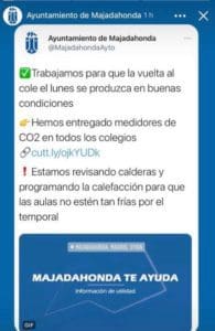 ALCALDE (PP-Vox): Los primeros mensajes fueron de confianza: «Majadahonda está preparada para el temporal de frío y nevadas previsto para estos días. De hecho, el Ayuntamiento, a través de la Concejalía de Medio Ambiente, mantiene activado su Plan de Inclemencias para hacerle frente y cuenta con una provisión de 27.000 kilogramos de sal. Para evitar la formación de placas de hielo se está esparciendo sal, especialmente en puntos críticos o de alto tránsito, tales como el acceso a centros hospitalarios, residencias o dependencias municipales, así como zonas peatonales o paradas de autobús y en la propia calzada. Además, si la acumulación de nieve superase los 4 cm de espesor, se pondrán en marcha medidas especiales como la eliminación mecánica de la misma sobre la calzada». ç