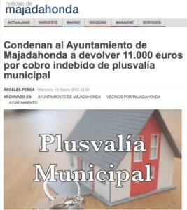Plusvalía Municipal: Con esta sentencia, «el consistorio de Majadahonda tendrá que devolver sus 11.000 euros al vecino, pese a negar dicha devolución desde hace casi 10 años». Lejos de reintegrar el dinero al vecino que ganó el pleito, la mayoría absoluta del PP en Majadahonda ha decidido recurrir la decisión judicial «para salvaguardar sus intereses»