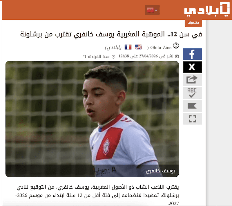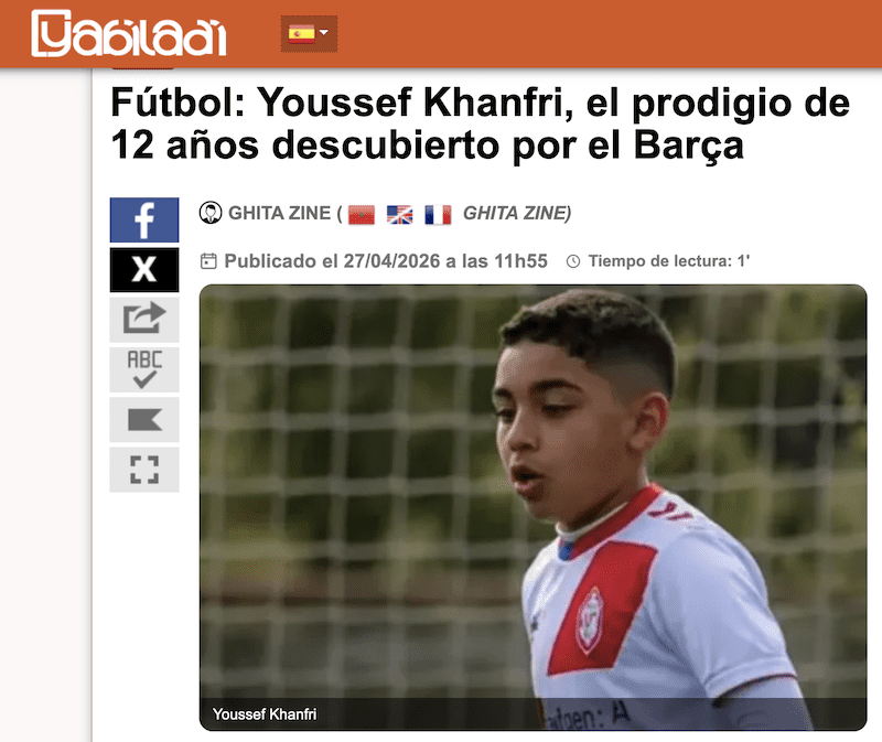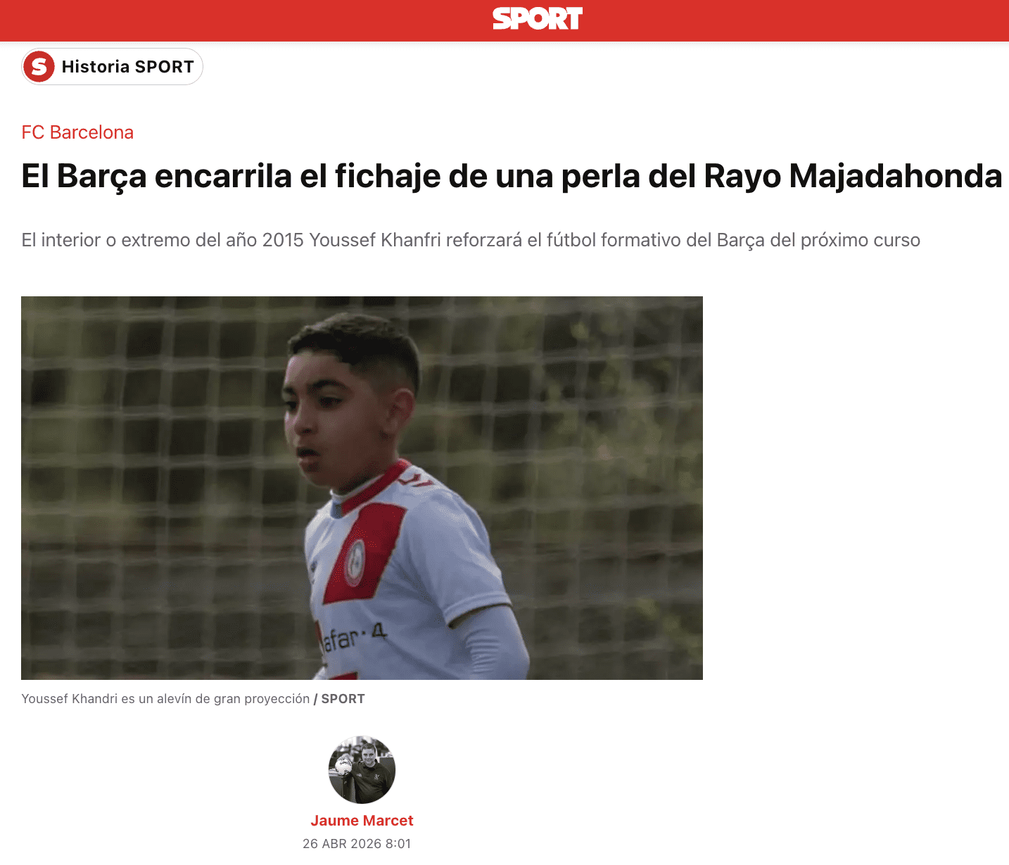 EL PERIODISTA JAUME MARCET DEL DIARIO «SPORT» SEÑALA QUE «EL INTERIOR O EXTREMO DEL AÑO 2015 YOUSSEF KHANFRI reforzará el fútbol formativo del Barça del próximo curso» y avanza que Hugo Galdeano, interior malagueño del Sub-12 blaugrana, ya no será el más pequeño de los residentes de La Masia. Su fuente es el periodista audiovisual Carles Aguilar, quien adelantó en su cuenta de X esta incorporación «de gran futuro para la cantera blaugrana». El texto de la noticia dice que el alevín de primer año Youssef Khanfri «está muy cerca de fichar por el Barça. Los cazatalentos del FC Barcelona detectaron este jugador de oreigen marroquí del Rayo Majadahonda y todo está encaminado para que este futbolista de gran clase y velocidad forme parte del Sub-12 del Barça para el curso 2026-27. Khanfri puede jugar por dentro o ser un futbolista que desequilibre por las bandas pero hasta que no se incorpore al Barça no sabremos en que demarcación lo situarán los técnicos del Barça. La generación del 2015 del Barça tiene grandes talentos como Ivan Cortés, Alder Jiménez o Sandro Liparteliani pero el club blaugrana siempre rastrea el mercado catalán y español para mejorar». Y concluye: «Esta incorporación del talentoso Youssef Khanfri se unirá a otras perlas que hemos avanzado en Sport como Víctor Barbany, Omri, Sabadí o Álex López entre otros.