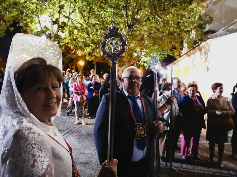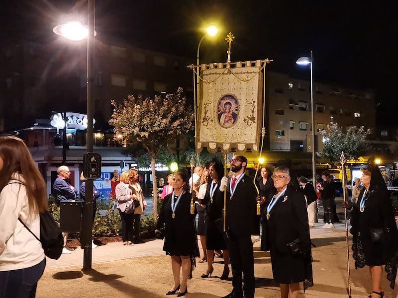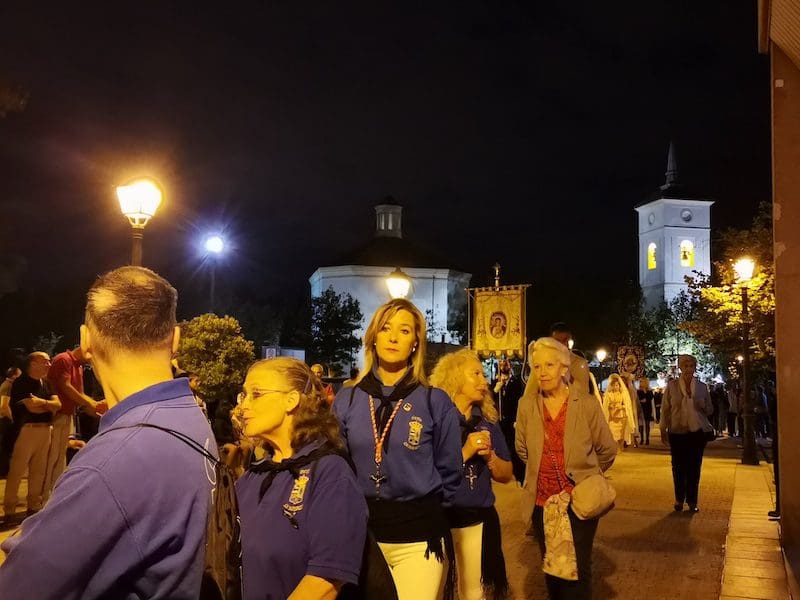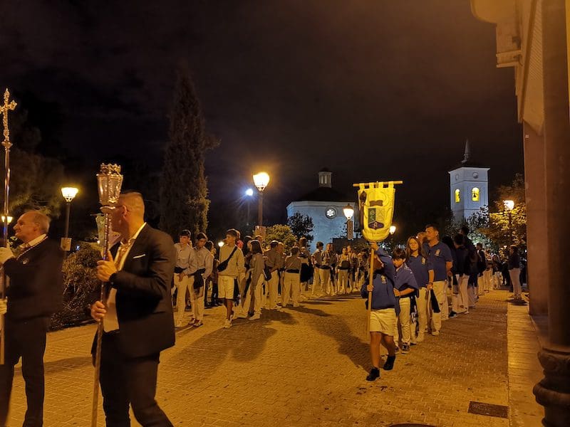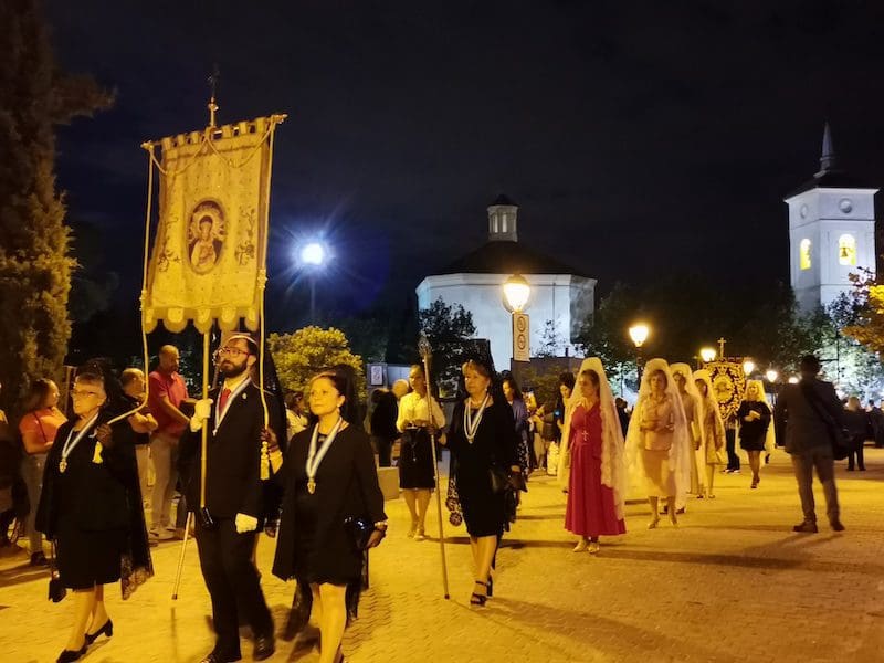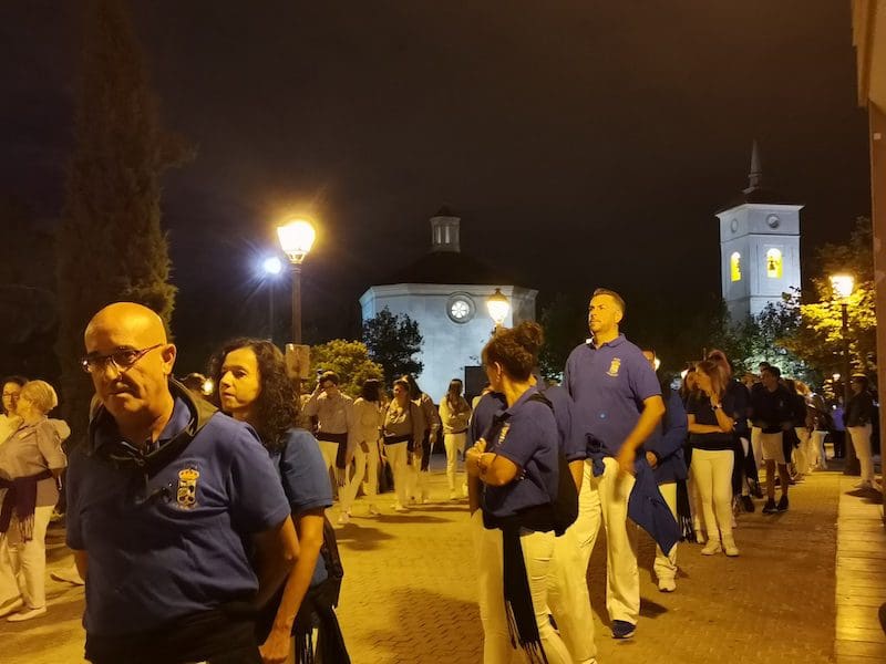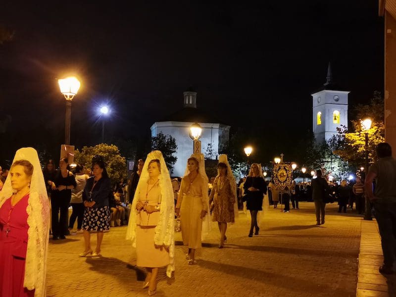 A continuación, de nuevo volvía a destacar la distinción y la tradición, en este caso representada por preciosas mantillas blancas sobre majestuosas peinetas, accesorios que aportan una gran belleza tanto a la mujer que los luce como al lugar que ocupan en este tipo de comitivas. Seguidamente, tras su estandarte, desfiló el Patrón de Majadahonda, acompañado por el párroco Juan Francisco Pérez Ruano y las autoridades locales. Y en último lugar, pero con un papel relevante, la Agrupación Musical “La Columna de Alcalá”, que una vez más aportó el ambiente procesional indispensable en este tipo de actos. Y no podemos olvidar a Isma y Dani que, con sus polémicos cohetes, anunciaron la llegada de la procesión.