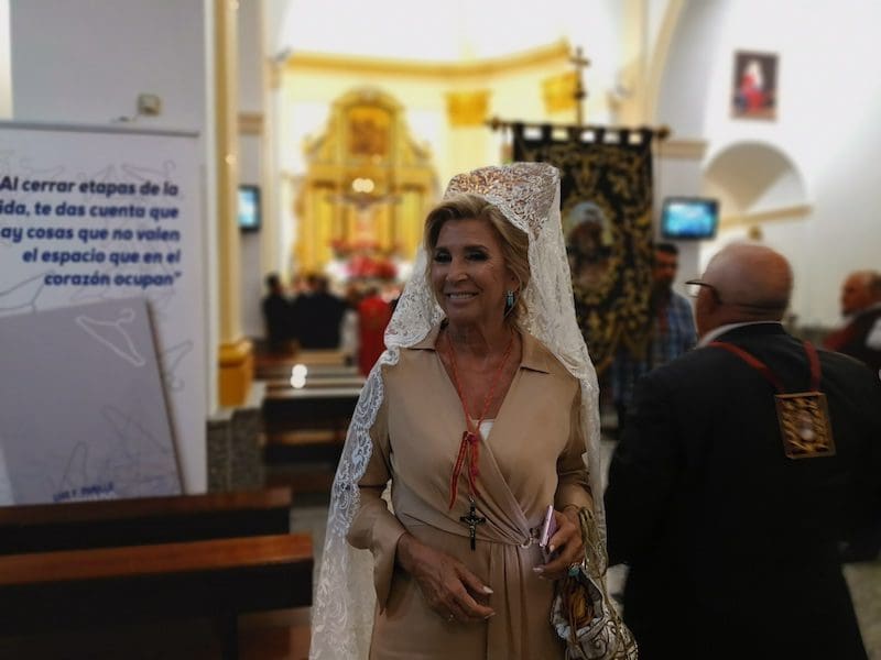Las preciosas mantillas blancas sobre majestuosas peinetas aportan una gran belleza tanto a la mujer que los luce como al lugar que ocupan en este tipo de comitivas
