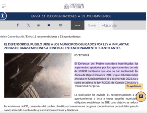 «El Defensor del Pueblo considera injustificados los argumentos de los ayuntamientos de más de 50.000 habitantes que aún no han implantado las Zonas de Bajas Emisiones (ZBE) que debería funcionar desde el 1 de enero de 2023, tal y como establece la Ley»