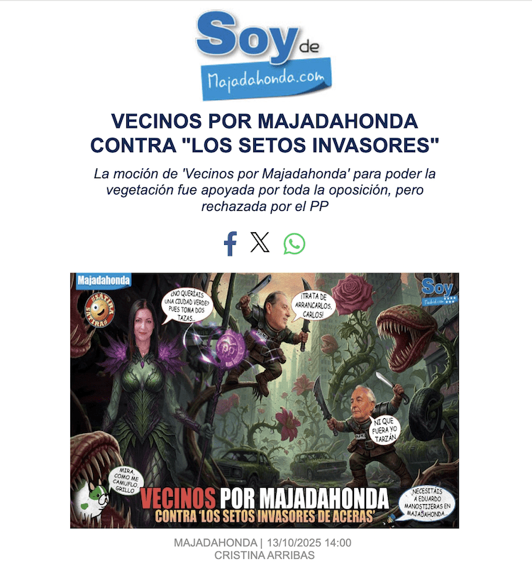 La viñeta de la revista «Soy de Majadahonda»: «Vecinos por Majadahonda» contra los «setos invasores de aceras»: «Ni que fuera yo Tarzán», dice el concejal Carlos Bonet con un traje de Indiana Jones. «¡Trata de arrancarlos Carlos!», señala su compañero de escaño, Federico Martínez. Y la alcaldesa exclama: «¿No querías una ciudad verde? pues toma dos tazas», a lo que el «Pepito Grillo» del Ayuntamiento le replica: «Necesitas a Eduardo Manostijeras en Majadahonda»