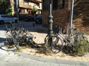 EL DUENDE MAJARIEGO. No todo son quejas ni reclamaciones en Majadahonda. Tampoco anécdotas relacionadas con este tiempo tan convulso que nos ha tocado vivir. Y mucho menos sobre politiqueos cansinos. En esta ocasión un vecino de El Tejar remite a este duende una curiosa y amable foto. Se trata, como dice Nacho, de una «familia de bicicletas cuyos dueños las tiene amarradas a la señalítica callejera porque supongo no tendrán sitio en su casa para almacenarlas». Asegura el remitente que la foto la ha hecho «en diferentes estaciones del año, pero cuando más bonita es en primavera. Aparentemente no están abandonadas y hasta a veces presentan una agradable visión, pero nunca las veo funcionando, lo que me entristece pensando lo poco útiles que se deben sentir».