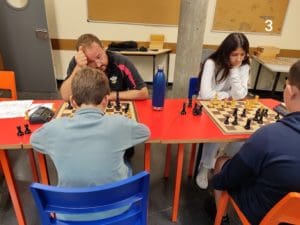 EL DOMINGO DÍA 21 DE SEPTIEMBRE DE 2025 ARRANCAMOS LA TEMPORADA. Con la victoria del primer equipo y sendas derrotas de los otros dos. Este año tenemos 3 equipos inscritos en la Liga de Rápidas madrileña. El formato es de 25+5, es decir, 25 minutos más 5 segundos por cada movimiento que cada jugador haga. Se juega los domingos y son dos rondas por día, soliéndose jugar una partida con blancas y otra con negras contra el mismo jugador. Habitualmente se jugaba a 14 rondas, pero este año se ha visto disminuido a 12 rondas únicamente. El domingo día 28 de septiembre, la jornada transcurrió de forma inmejorable para todos nuestros equipos. 3 equipos, 3 victorias, y muy buenas sensaciones en todos los tableros de juego. El primer equipo capitaneado por Santi consiguió un apabullante 3’5 a 0’5 en la tercera ronda. Para redondear la 4 jornada con un más que merecido 0-4. Según comentó en «petite commité» sus dos partidas fueron un robo a dama alzada. Pablo Guitiérrez volvió a casa tras su periplo europeo. Demostrando con creces que ha vuelto con más sabiduría ajedrecística, aun si cabe, de la que se fue. Convirtió sus dos partidas en dos valiosos puntos para nuestro equipo.