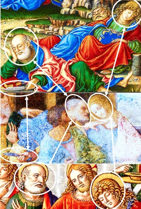 Comparativa de los apóstoles Pedro y Juan representados por Leonardo da Vinci (en medio) en La última cena a semejanza de las diferentes representaciones de Birago en el Libro de Horas Sforza: arriba, Pedro (con el cuchillo) y Juan en el Huerto de Getsemaní, y abajo los apóstoles Pedro y Juan en la santa cena. (The British Library Board (Add. MS 34294)).