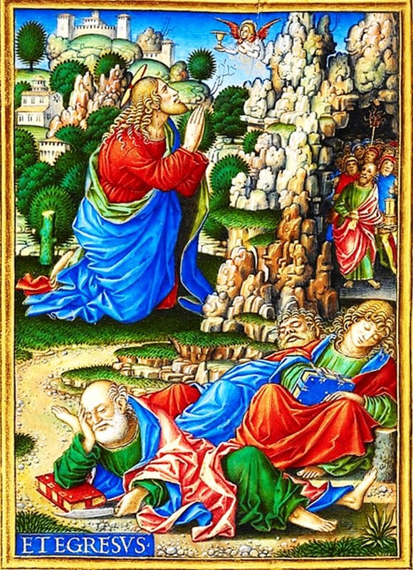 Lámina del Libro de Horas Sforza, realizado por el miniaturista italiano de la Corte de Milán, Giovan Pietro Birago, representando al joven Juan (el Evangelista) y a Pedro con un cuchillo, ambos con libros, mientras Jesús reza en el Huerto de Getsemaní justo antes de ser traicionado por Judas, que le entregará para su crucifixión. (The British Library Board (Add. MS 59874)).